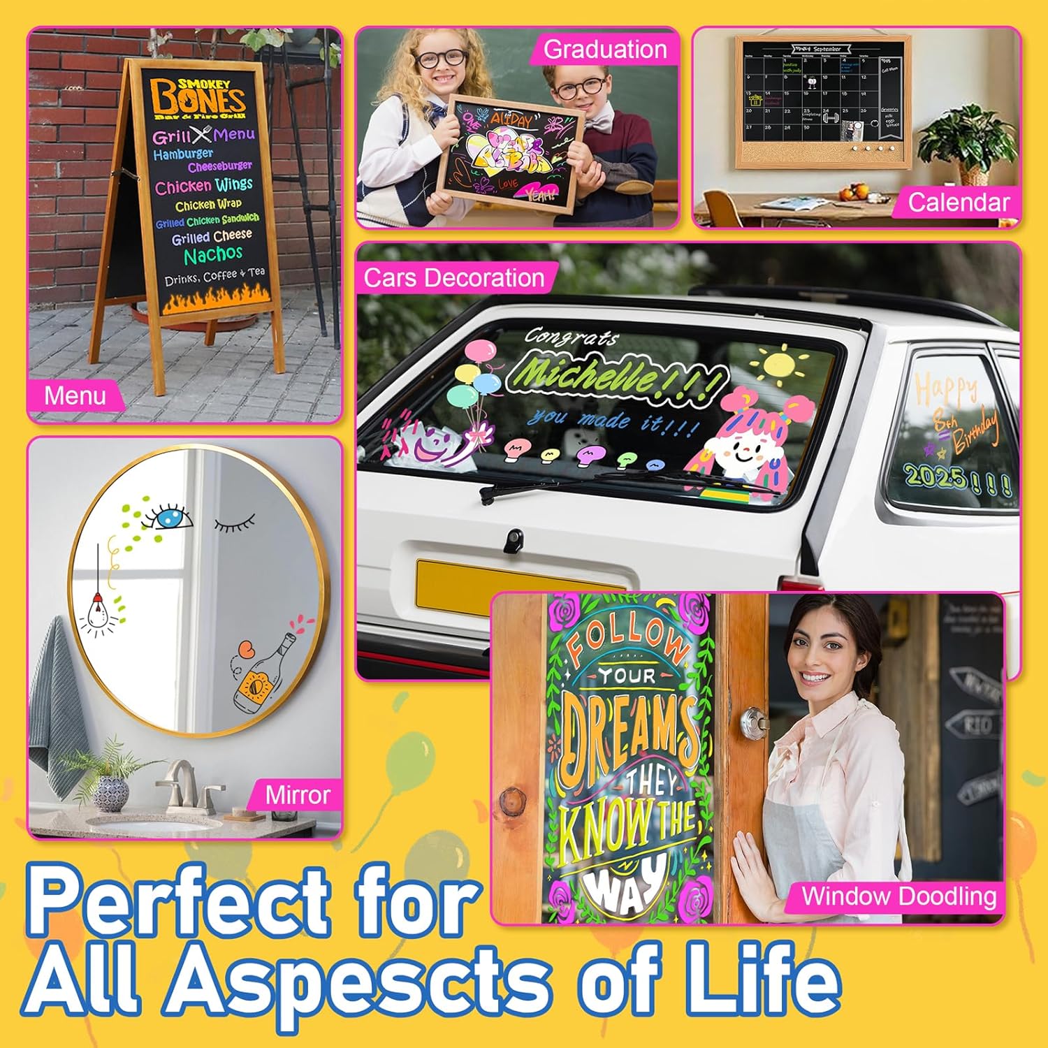 - Perfect for decorating car windows, mirrors,Blackboard and even tires. Make beautiful artwork to creating holiday decorations for Christmas,4th of July,Halloween,Birthdays,Graduation Car Decorations and more. Have fun and be creative!