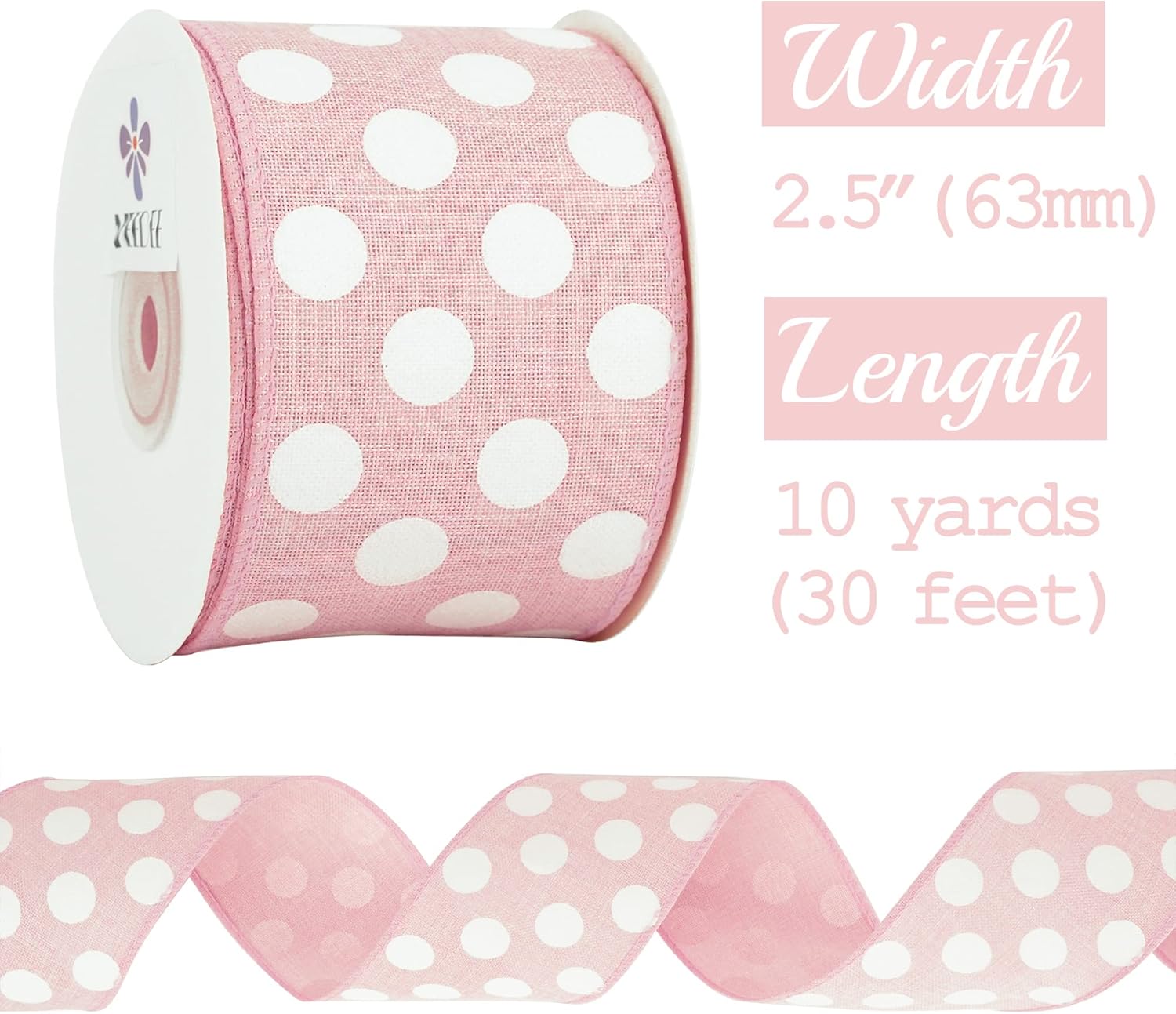 - Pink ribbon with white polka dot wired ribbon for wreaths or bows 2.5" x 10 yards by the roll. The ribbon has an pink threaded wired edge. Ribbon is shipped on the spool and would be beautiful for all of your craft needs, great product for wreath makers!