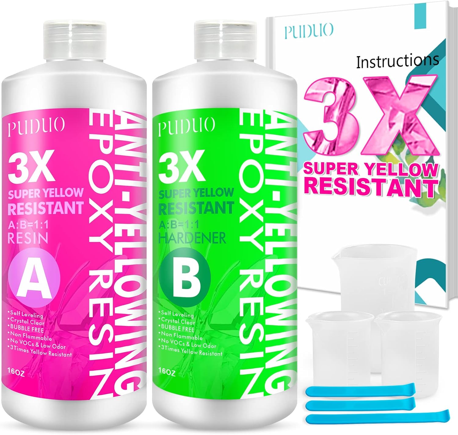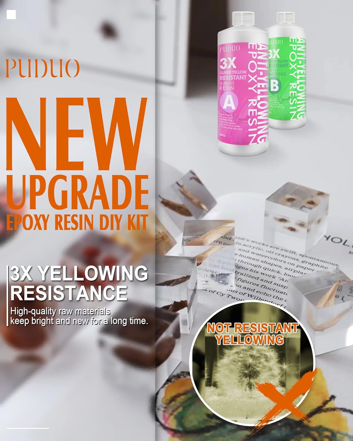 - Epoxy resin specifically formulated with a super anti-yellowing agent - PUDUO Epoxy Resin new product resists fading and yellowing, is high-gloss, and has super anti-yellowing and UV resistance. This products will keep your projects looking great for a long time.