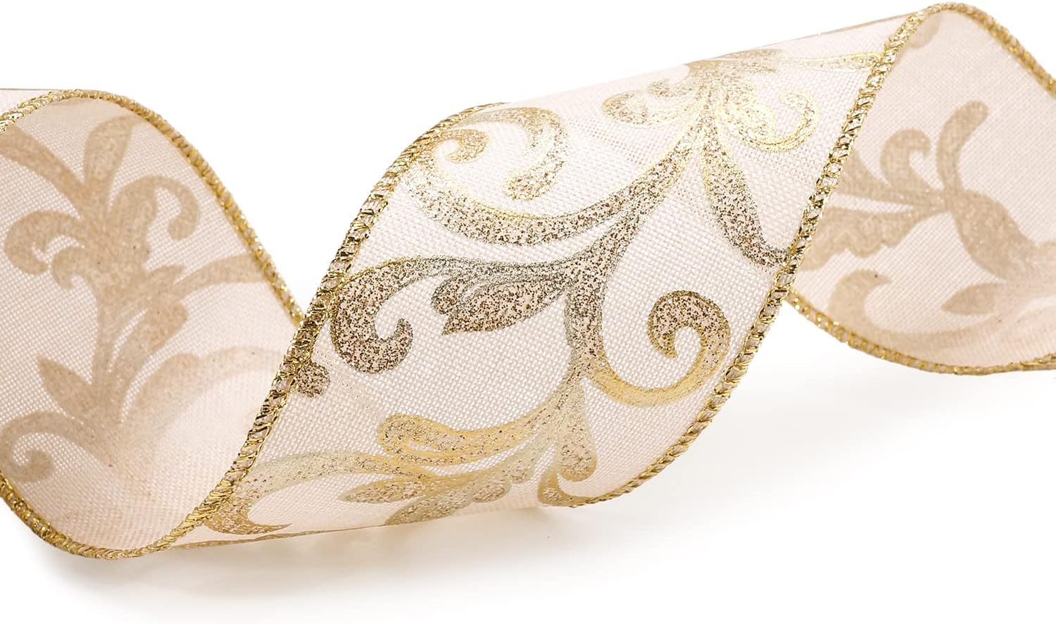 CT CRAFT LLC Tan Burlap Gold Swirl Wired Ribbon 2.5 Inch x 10 Yards for Christmas Home Decor Tree Topper Bow Gift Wrapping DIY Crafts Wreath Garland