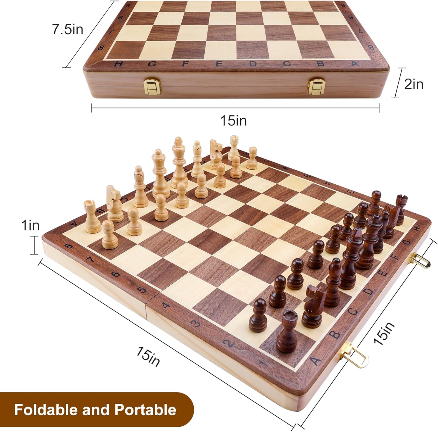 - [Portable Folding Inlaid Walnut Chess Board] : The 15" x 15" chess board is made of smooth inlaid walnut. It folds in half to store the magnetic chessman in the sturdy chess box.A Felted bottom to protect the chessboard from scratches will last you for a long time. An excellent travel companion for players on the go who will especially appreciate this distinctive travel magnetic chess set. This chessboard can be folded easily and locked with two metal latches for convenient carry and storage.