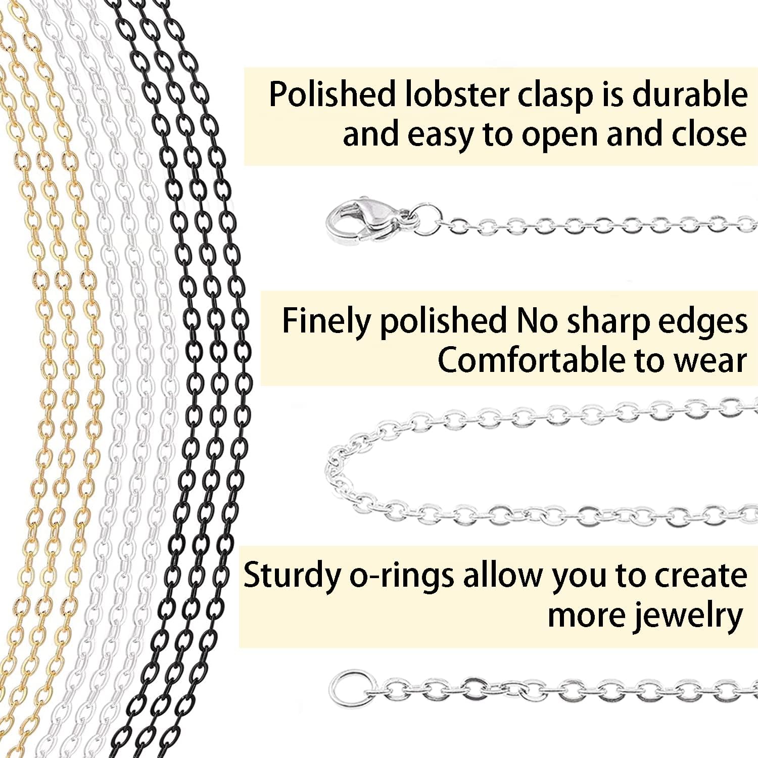- THIN & STRONG: The size of the chain links are 2.5mm long, 2mm wide, 0.5mm thick; the lobster clasps are 10mm long, 5mm wide; the jump rings are 4mm long, 4mm wide - Small, fine, but strong and sturdy. Great for jewelry making findings supplies.