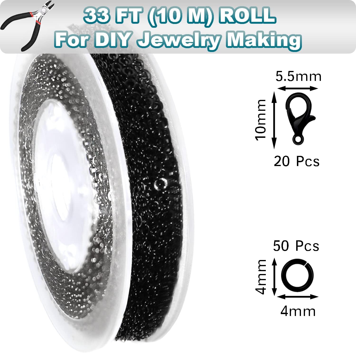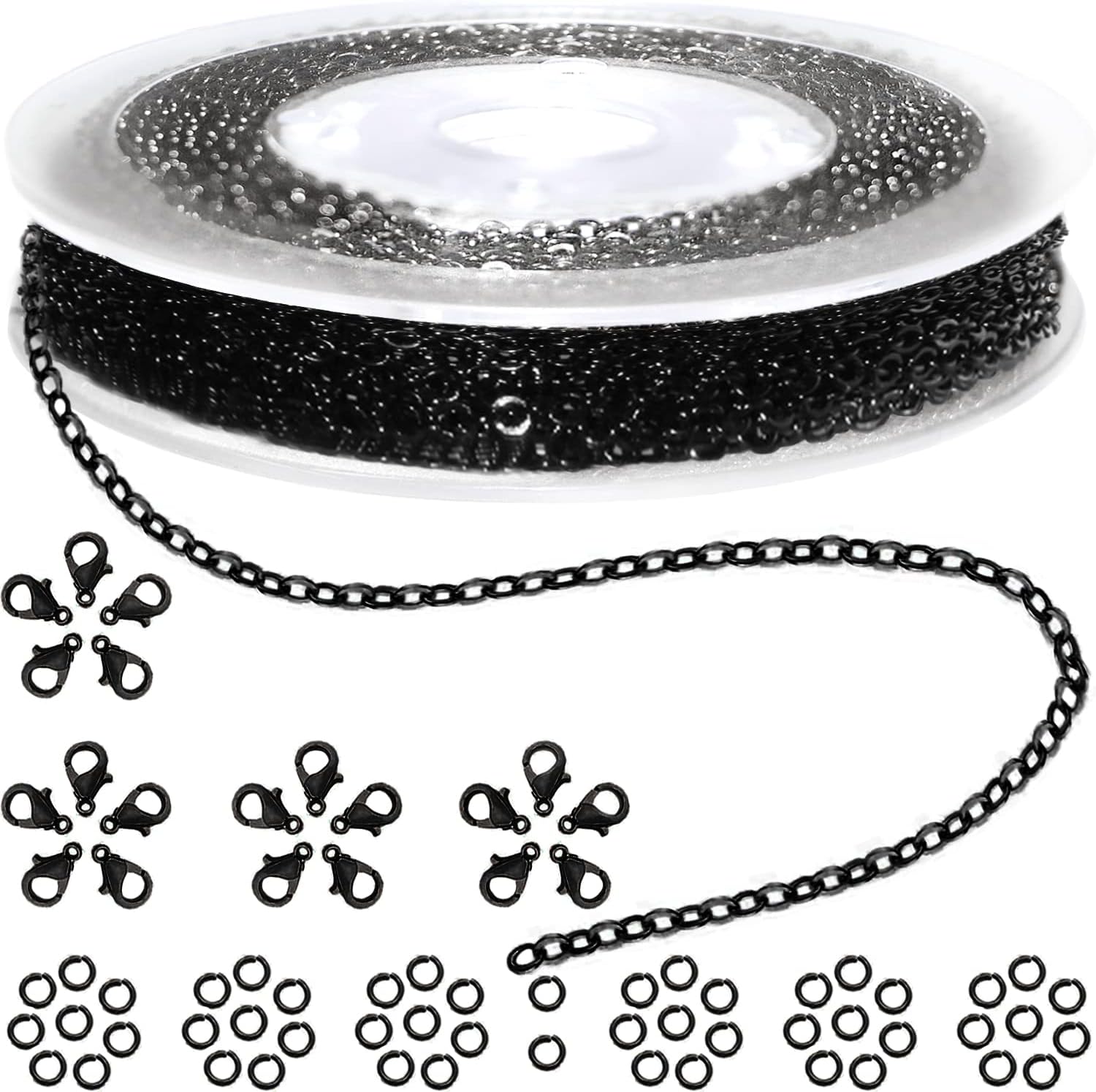 - 33 FEET ROLL SET: 33ft (10m) Black Jewelry Making Chain Roll - 20 Black Lobster Clasps - 50 Black Jump Rings.