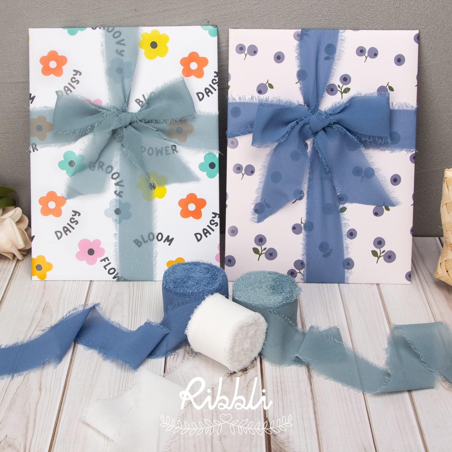 Ribbli Chiffon Silk Ribbon, 1.5 in x 30 Yards, White/Slate Blue/Dusty Blue Fringe, Wedding Invitations, Bridal Bouquets, Flower Arrangement
