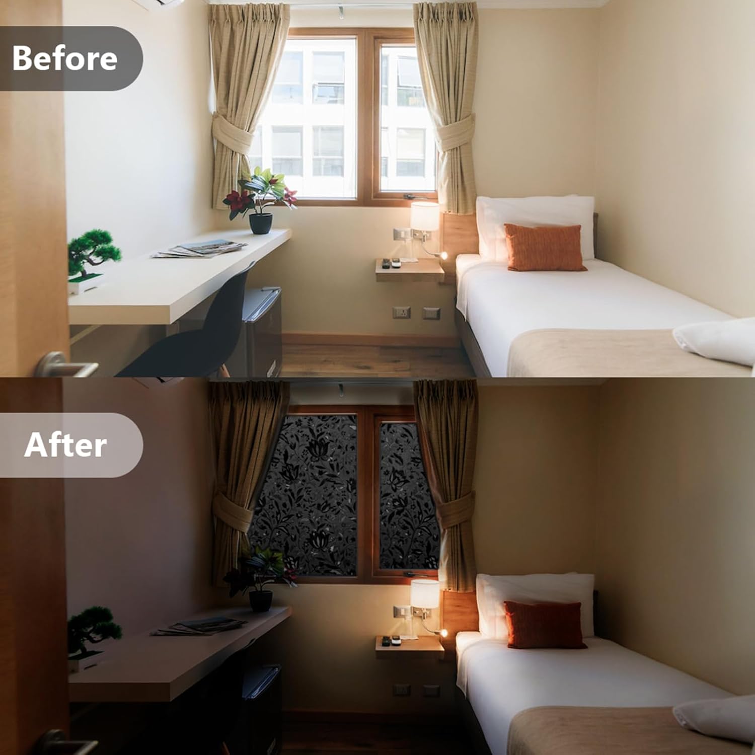 - 100% PRIVACY PROTECTION: This is a blackout window film, blocks 100% of UV rays and provides two way privacy, which can instantly darken the room, making it ideal for people who sleep during the day or sleep light at night