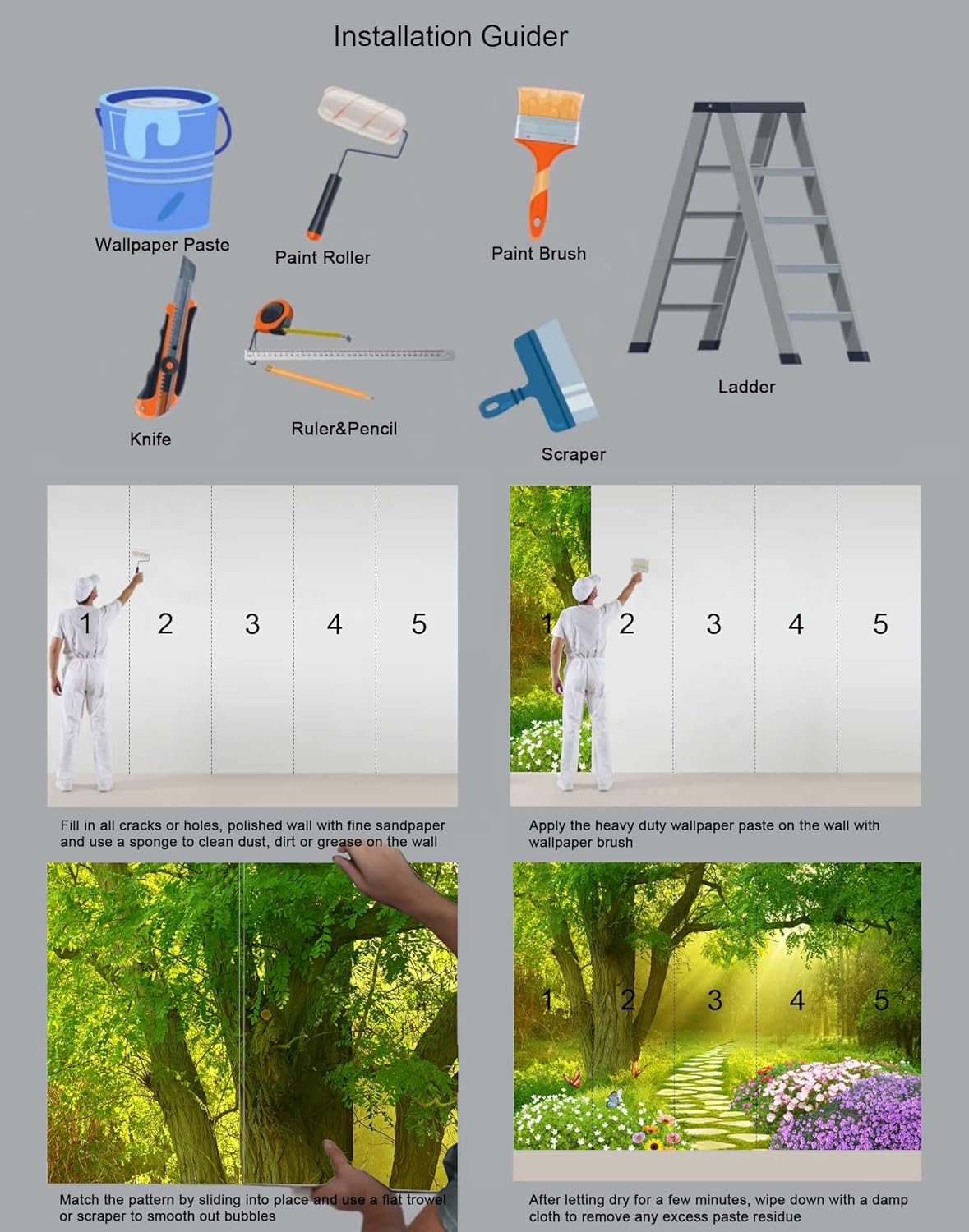 - Easy Installation 1.Fill in all cracks or holes and clean dust dirt and grease on the wall surface. 2. Apply the heavy duty wallpaper paste on the wall not mural. 3. Use a spirit level to mark each strip location. 4. match the pattern by sliding into place. 5.use a scraper to smooth out bubbles press. 6. Let dry for a few minutes and that's it! Please Note: Not self-adhesive. We recommend to use a standardized fleece wallpaper paste.