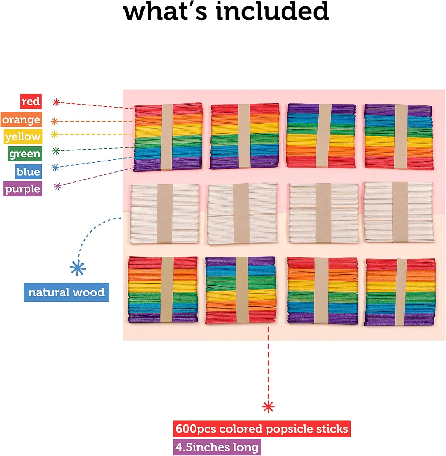 - VALUE PACK COLORED CRAFT STICKS — Includes 600pieces popsicle sticks for crafts, each 4.5 inches long, in 7 bright colors: natural wood, red, blue, green, yellow, orange, and purple.