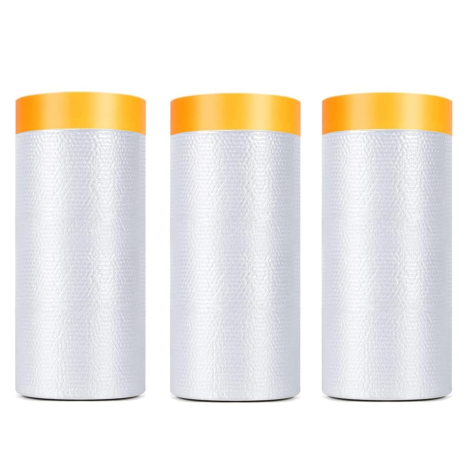Painters Plastic With Tape, Pre-Taped Masking Film, 3 Rolls Automotive Best Tape and Drape, Paint Adhesive Protective Film Roll for Covering Skirting, Frames, Cars and Auto Body (5 X 65-Feet) (3)