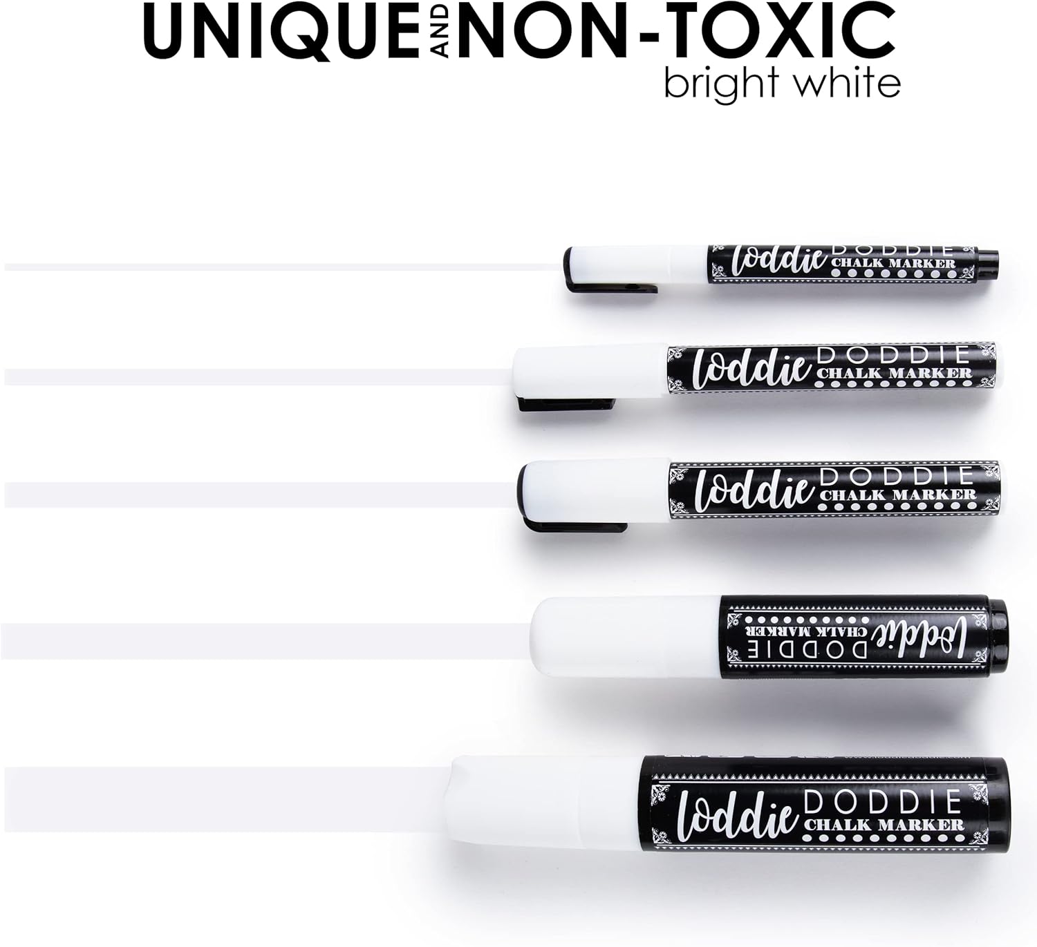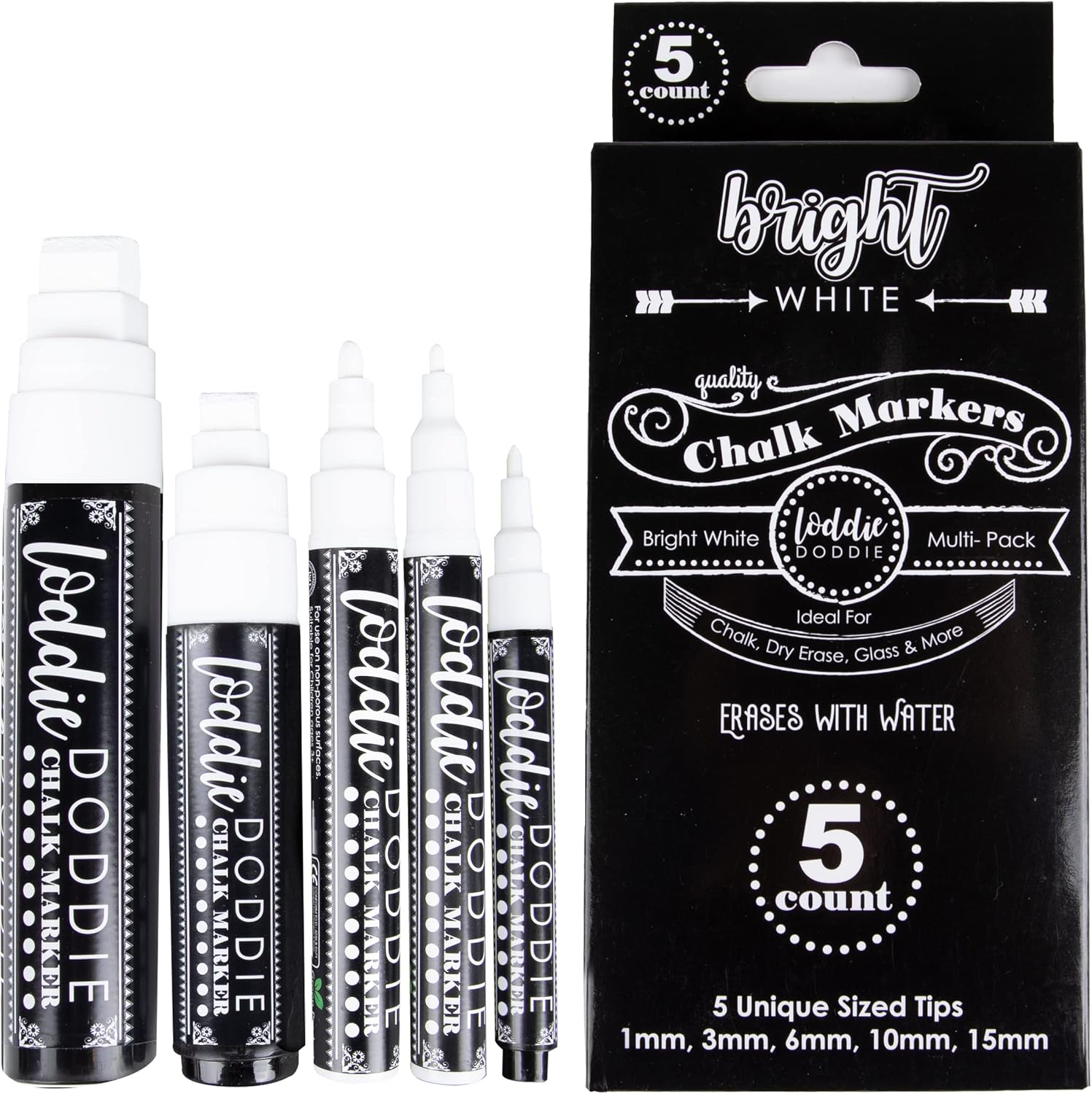 Loddie Doddie Erasable White Chalk Markers for Signs, Blackboard, Glass - Ultra Fine, Medium, Broad Tips (1mm, 3mm, 6mm, 10mm, 15mm) - Liquid Chalk Markers - Pack of 5