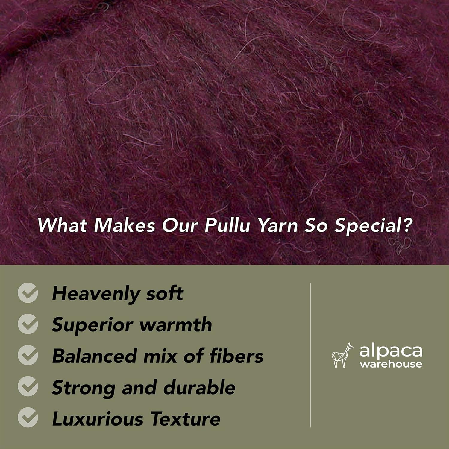 - Baby Alpaca and Merino Wool blend: Sourced directly from a manufacturer in Peru, each skein of yarn is custom-made for Alpaca Warehouse! As a result, we’re able to offer a premium wool that’s beautifully unique, surprisingly strong, and even hypoallergenic. Our yarn composition is 70% Baby Alpaca, 7% Merino Wool (21.5 mic.), 23% Polyamide.