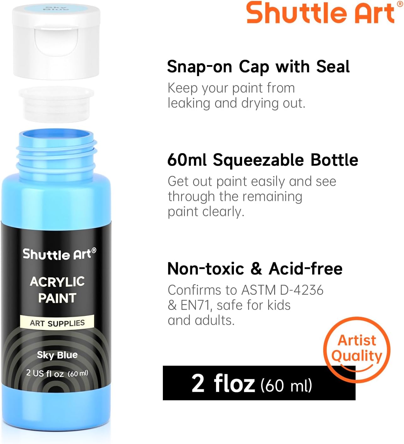 - 58 UNIQUE COLORS+2 WHITE & BLACK : Shuttle Art 72 Pack Acrylic paint set contains 58 unique colors and 2 white & black acrylic paint in 60 ml/2 oz bottles and 12 paint brushes, including the most commonly used colors and inspiring hot fluorescent and metallic colors to your art projects, ideal for painting and crafting