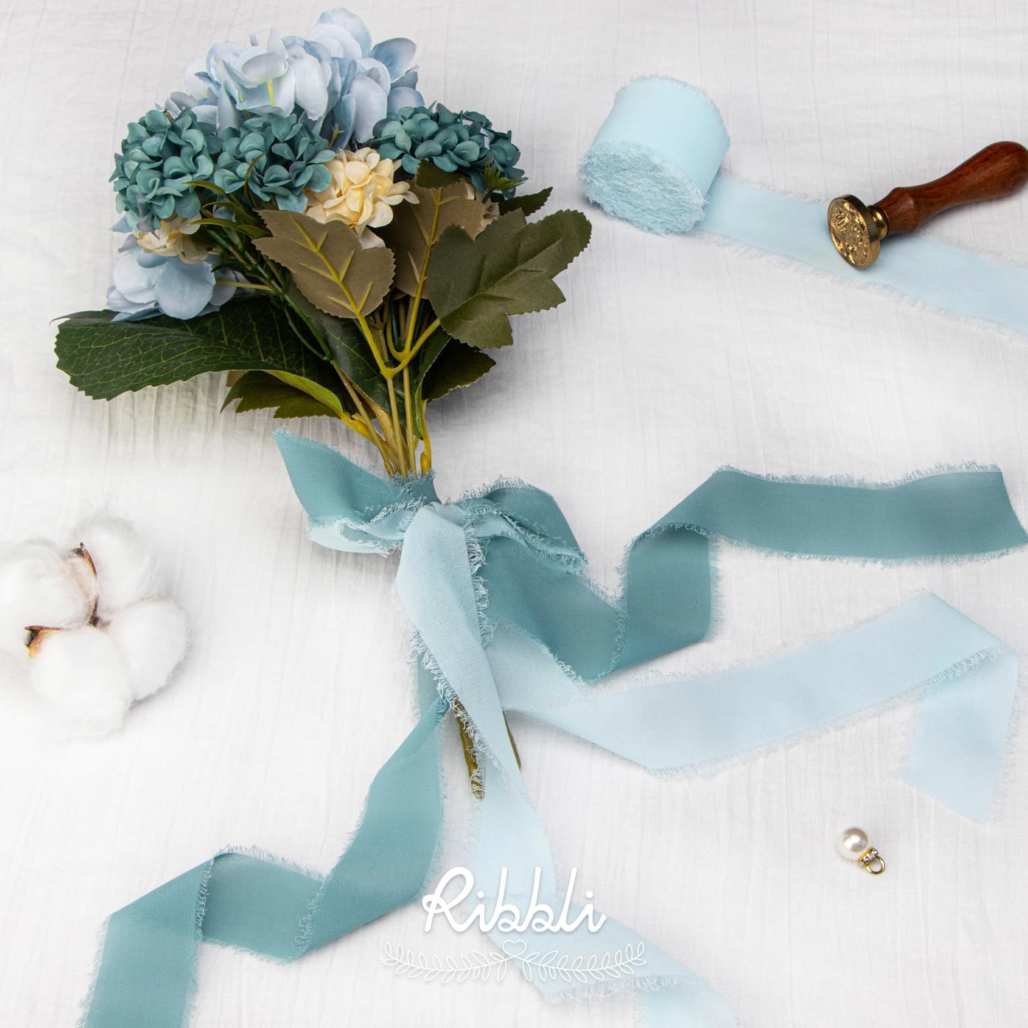 Ribbli Ice Blue Chiffon Silk Ribbon, 1-1/2 inch x 20 Yard, Handmade Fringe, Wedding Invitations, Bridal Bouquets, Home Decor