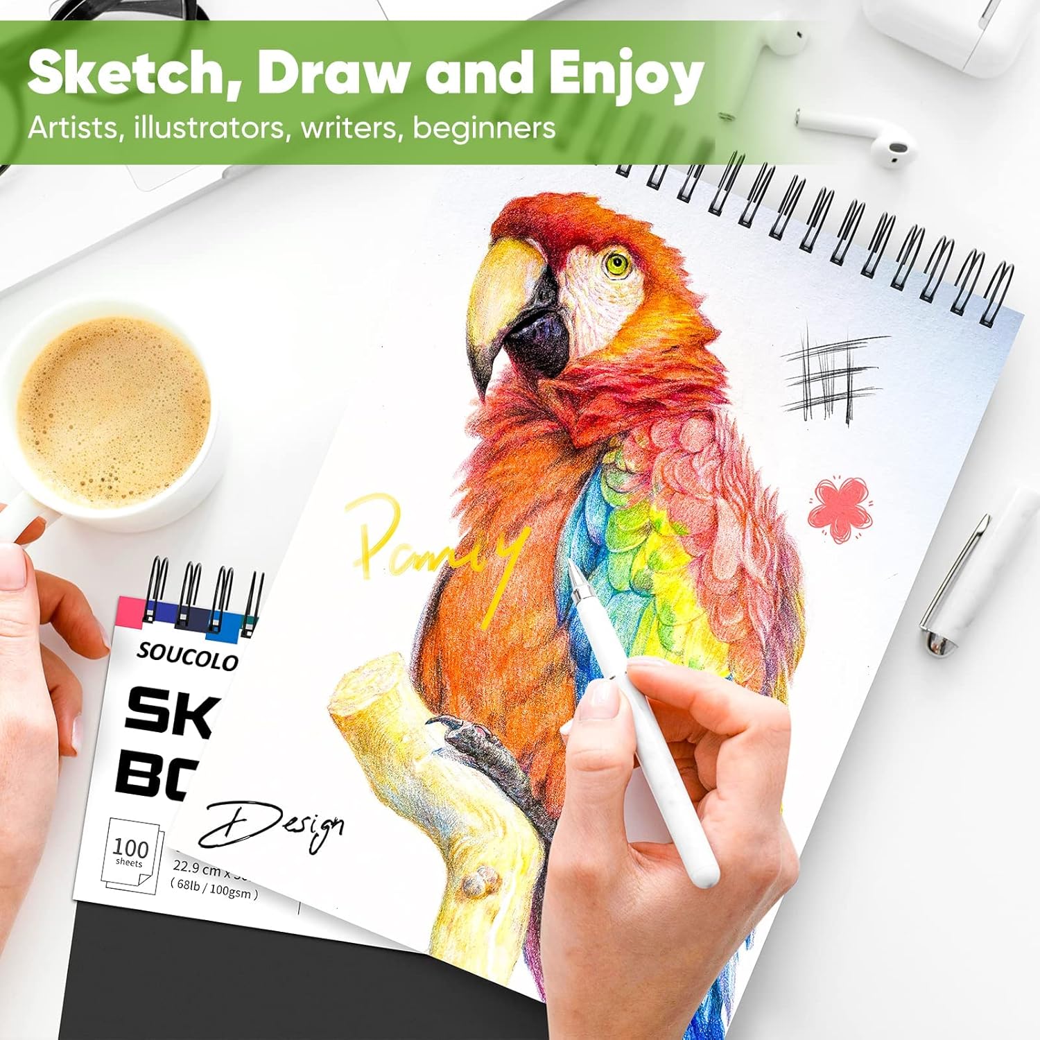 Soucolor Artist 9x12 Sketch Book Set, 4 Pack 100-Sheet Spiral Drawing Pads (68lb/100gsm) | Acid-Free Drawing Paper for Teens, Adults Classroom Art Supplies, Charcoal, Graphite, Pastel Pencils & Sticks