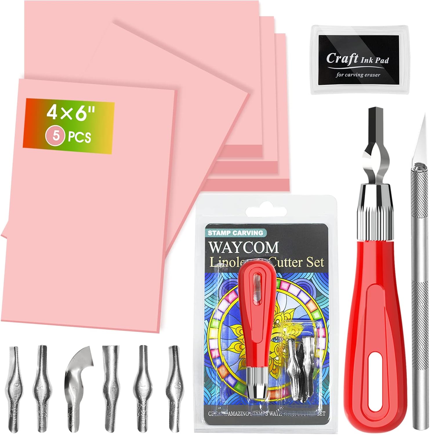 - What's Included: The package comes with 5 pcs Rubber Carving Blocks, 1 Linoleum Cutter Kit with 6 pcs Types Blades, 1 Black Ink Pad,1 pc Hobby Knife Includes 5 pcs carving blades