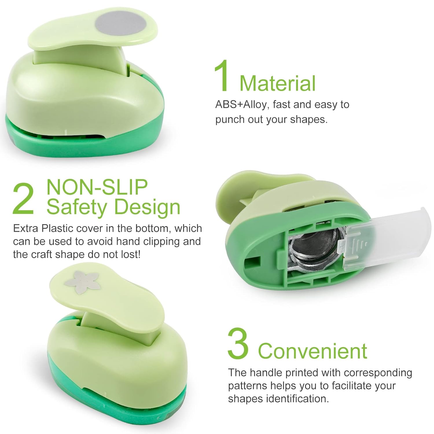 - What you get : This paper punch set includes paper punches in two different shapes-Round, Star, Square, Flower, Leaves, butterfly, Wave Circle Shape paper punch & Heart hole punch. Different paper punch shapes combination set is more convenient to make. The hole puncher for crafts ergonomic handle does not cause a paper jam, fast and easy to punch out shapes