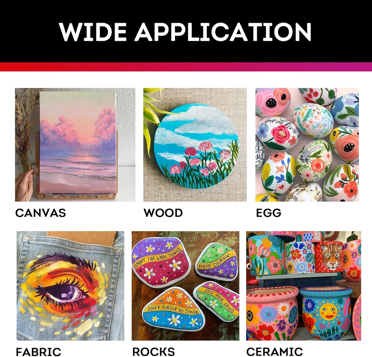 - VERSATILE USES: These acrylic paints dry quickly and adhere extremely well to surfaces. They are permanent, waterproof and will not fade and can be used indoors or outdoors, on walls, paper, glass, rocks, canvas, ceramics, fabric, plastic, metal or other materials. Suitable for everyone from beginner to intermediate or professional.