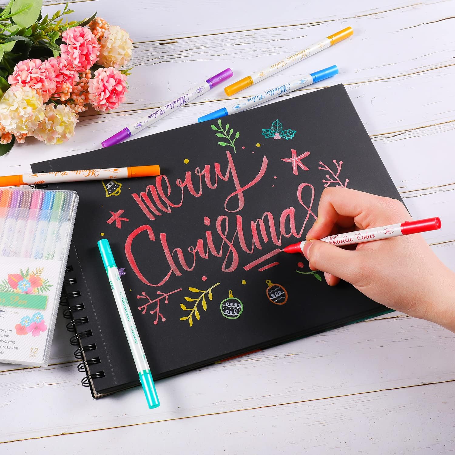 - Vibrant Glittery Colors - 12 vivid metallic colors for opaque writing, decorating, doodling, drawing, or coloring, even on dark and colored paper. Each metallic color is attractive and adds a splash of creativity and fun to objects. Thanks to the metallic sparkle of the ink, the lettering and marks made will be both pronounced and eye-catching