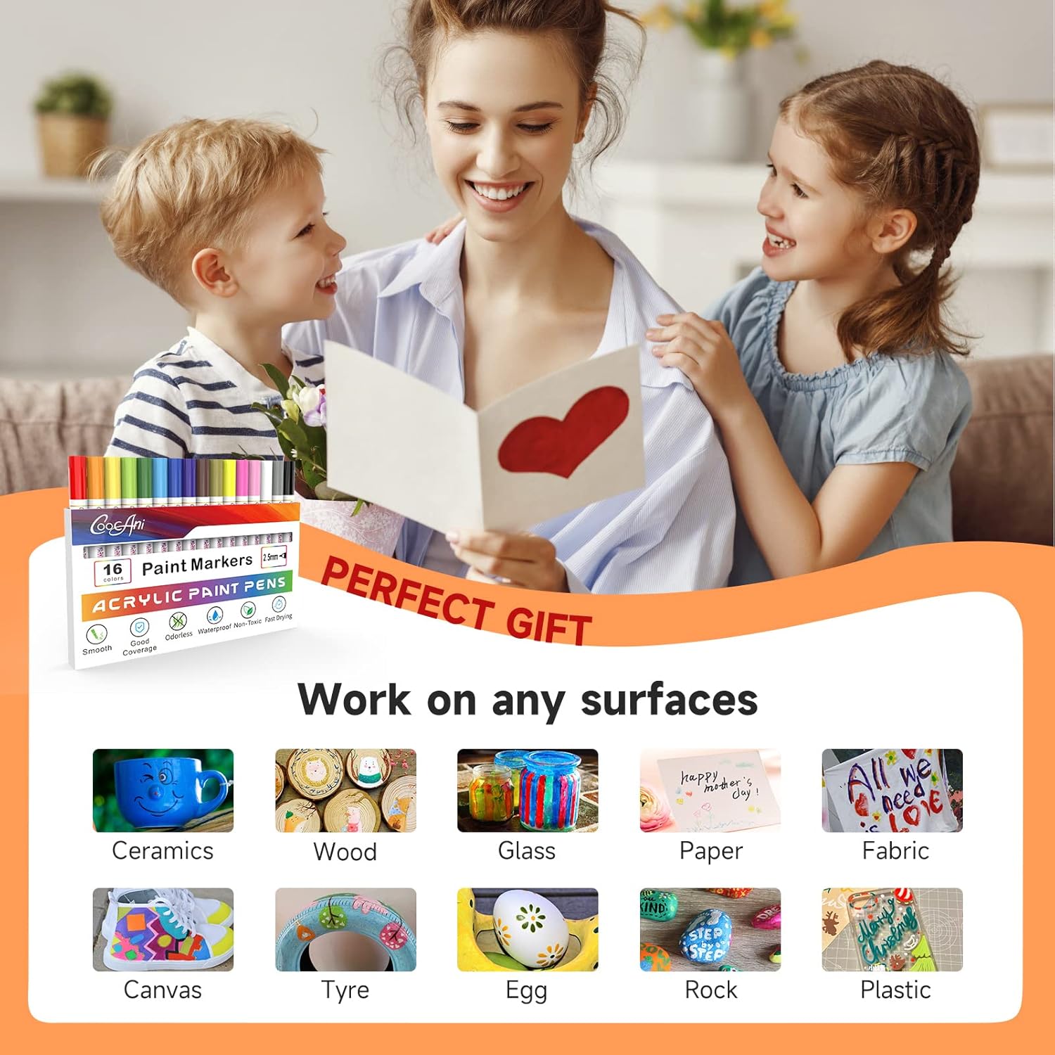 16 Colors Permanent Markers, Acrylic Paint Pens for Rock Painting, Canvas, Wood, Glass, Mugs, Fabric, Ceramic,Lettering,Card Making DIY Crafts (2.5MM Medium Tip)