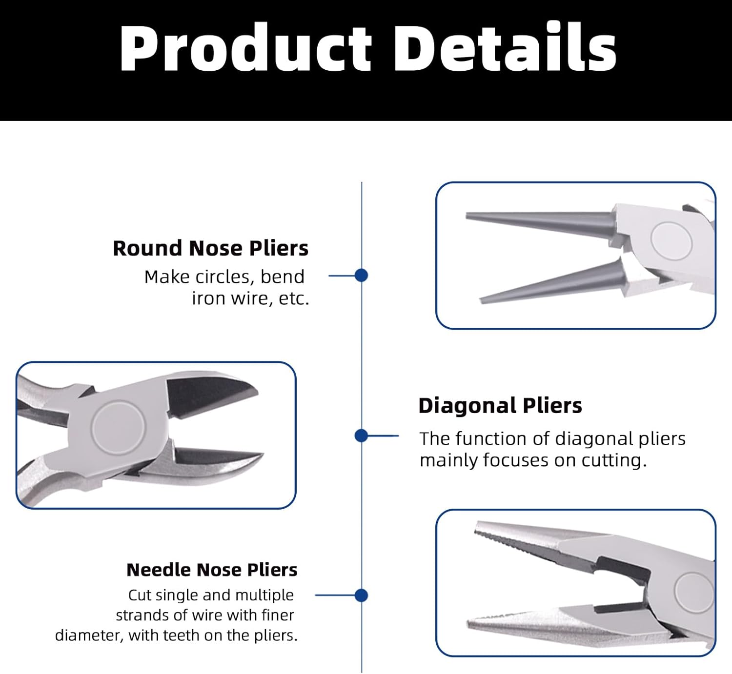 - ā[Multi-function Pliers]: Needle nose pliers can be used for bending, gripping, crimping, opening and closing jump rings. Round nose pliers can be used for forming loops in wire and wire wrapping. Side cutter pliers can be used to cut the string wire.