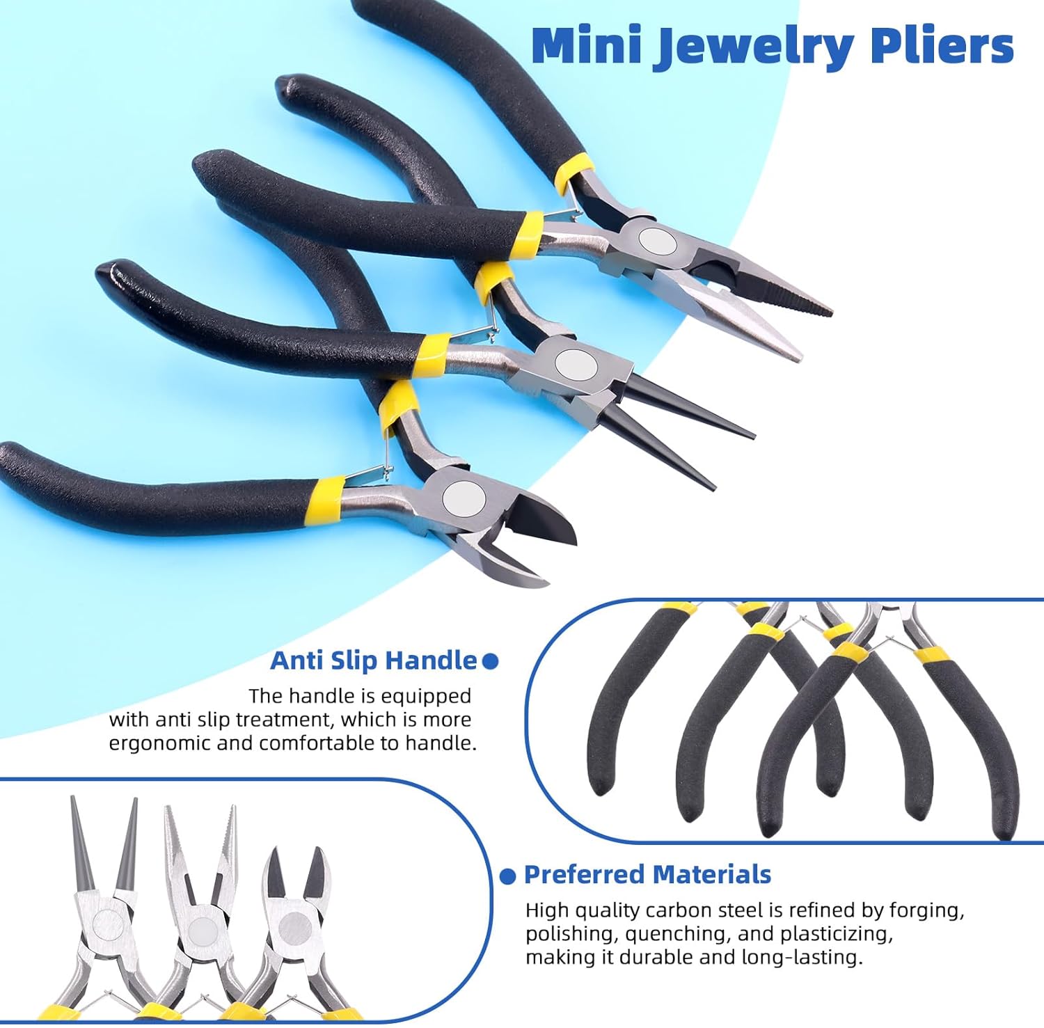- ā[Superior Pliers]: Our jewelry pliers tool kit has three necessary pliers, needle nose pliers, round nose pliers and side cutter pliers, which are made of premium steel, polished with smooth surface, without sharp groove shear, do not worry about leaving marks on your jewelries, study for a long use. While they are coated with non-slip rubber handles, which is provide a comfortable grip, reduces hands strain. The embedded spring of jewelry pliers can absorb shock, provides precise cutting.