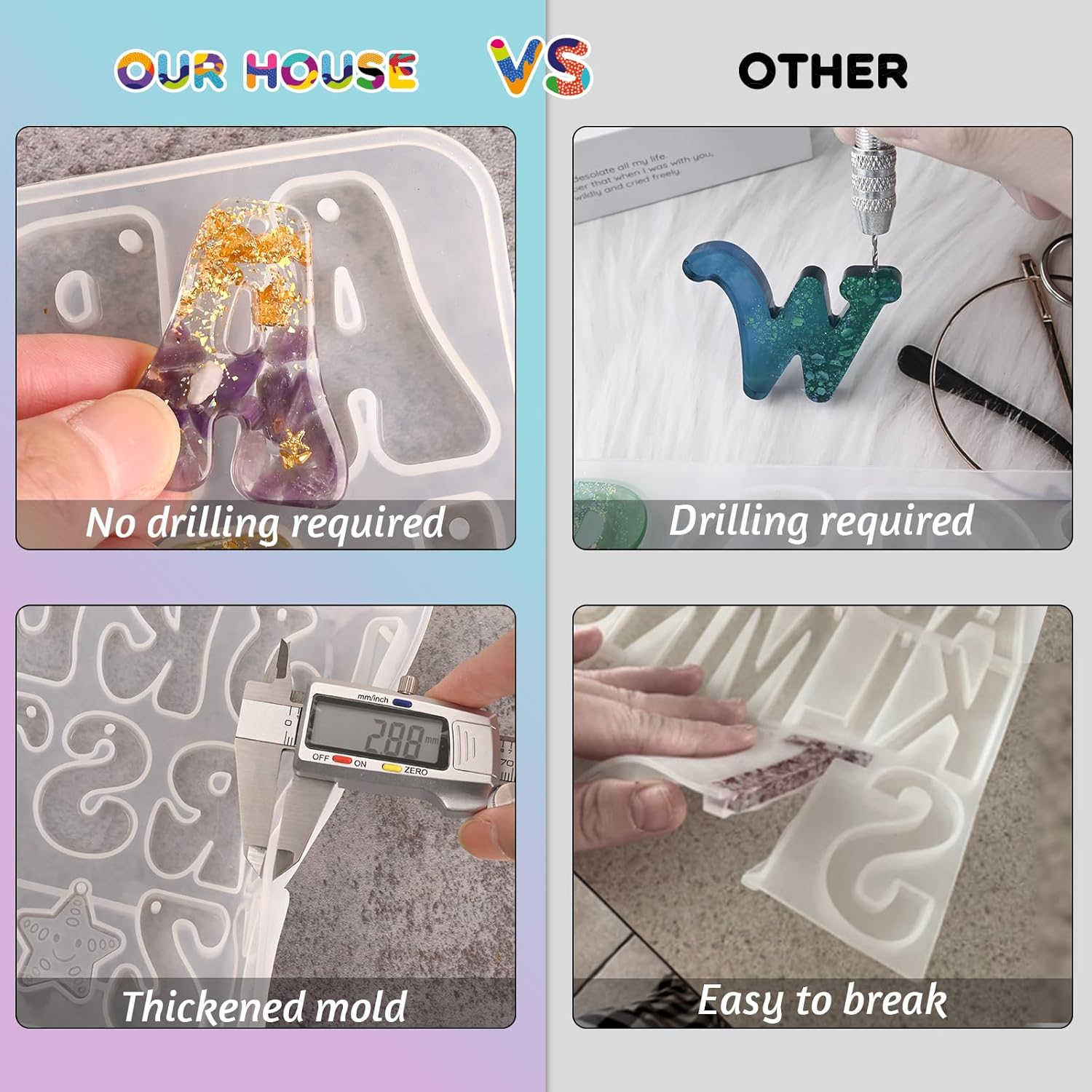 - Silicone Alphabet Resin Molds: This alphabet molds can applied with such materials as epoxy and UV resins,plaster, wax or soap,etc. DIY different handwork and ornaments, such as necklace pendant, crystal, jewels, keychain charm, earrings, handmade accessories, craft gifts, house number, etc.