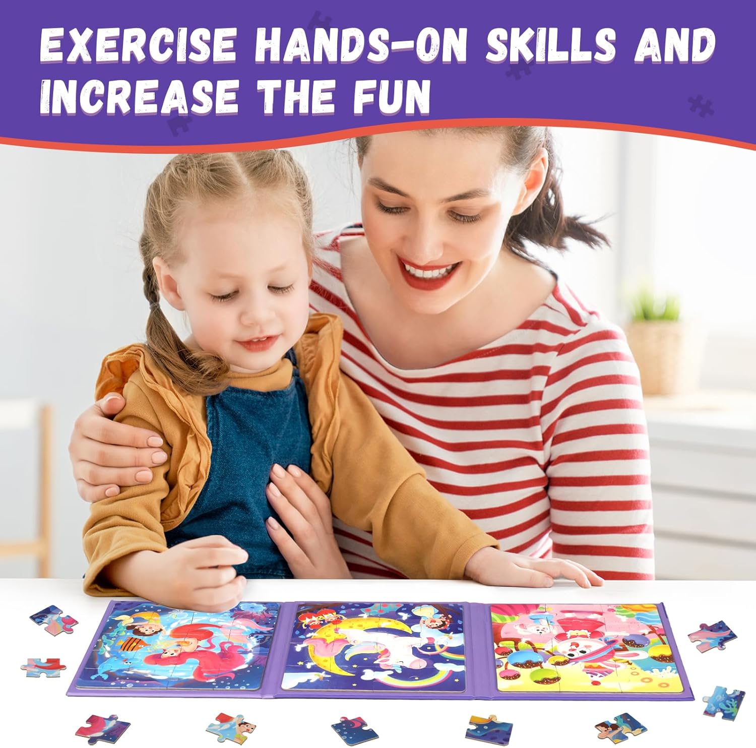 - 3 IN 1 KID PUZZLE: This set of mermaids magnetic puzzle has 3 parts with colorful images.There are 12, 16 and 20 puzzle pieces, 48 in total, ranging from easy to difficult, full of fun and challenges, helps kid develop motor skills and improve logical think
