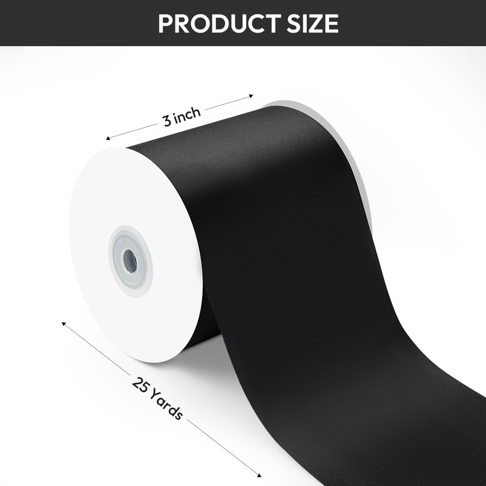 3" Width x 25 Yards Satin Fabric Ribbon, Black Ribbon Perfect for Wedding Car, Chair Sash, Grand Opening Ceremony, Big Bows, Embroidery, Floral Crafts, Halloween Party Decoration