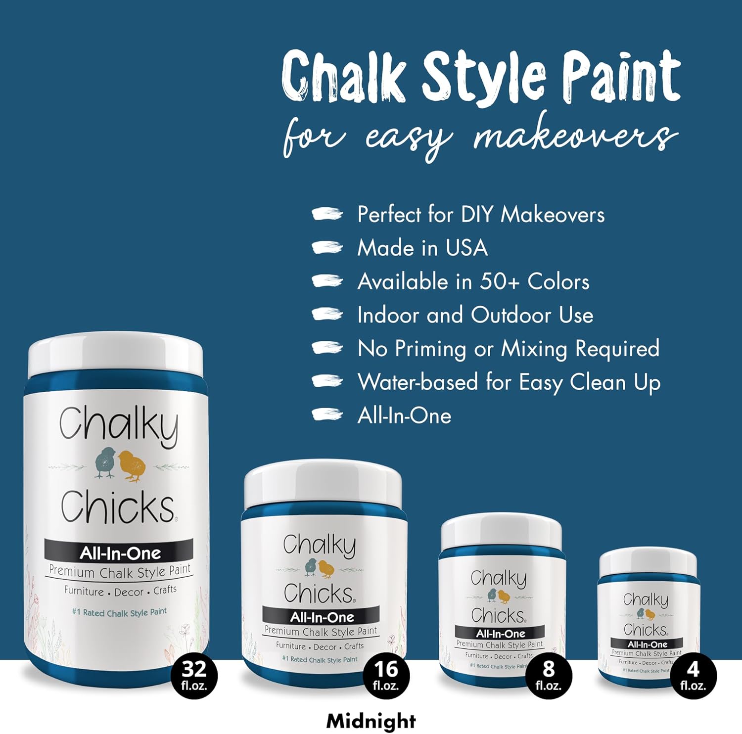 - TRANSFORM FURNITURE AND HOME DECOR WITH EASE: Chalky Chicks will save you time, money, and hassle. No sanding, priming, or multiple coats needed—just start painting your furniture with our cabinet paint no sanding or priming. Our paint is suitable for wood, metal, concrete, textiles, laminate, and more. Whether you prefer navy blue chalk paint, light blue paint, or green chalk paint, our chalk paint for furniture transforms any space with ease, making it ideal for DIY projects & craft painting.