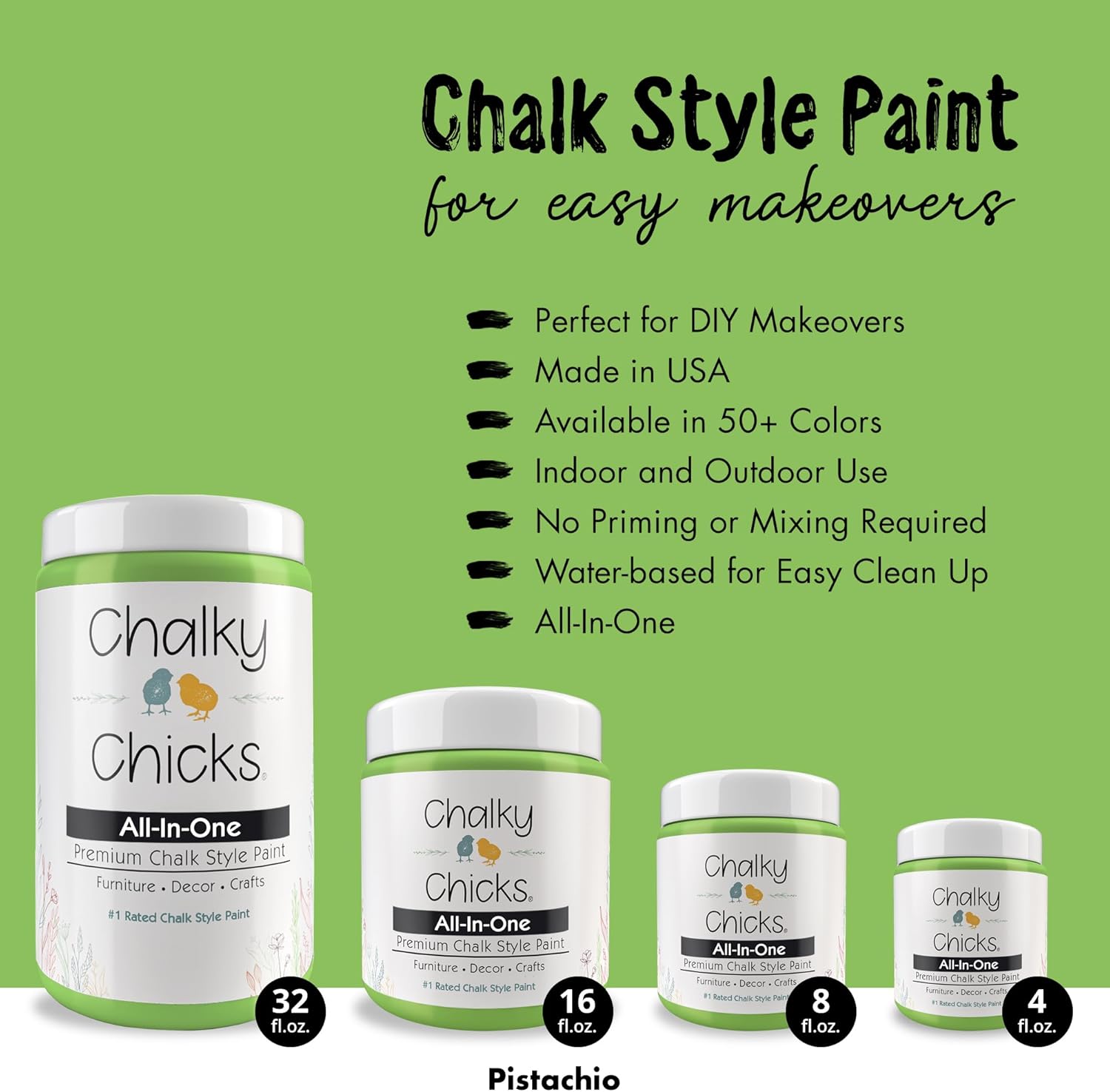 Chalky Chicks All-in-One Chalk Paint for Furniture or Cabinet - 4 Fl Oz - Matte Finish Pistachio (Lime Green) for Metal, Wood Furniture Paint - No Sanding All-in-One for Home Decor & Crafts, USA Made