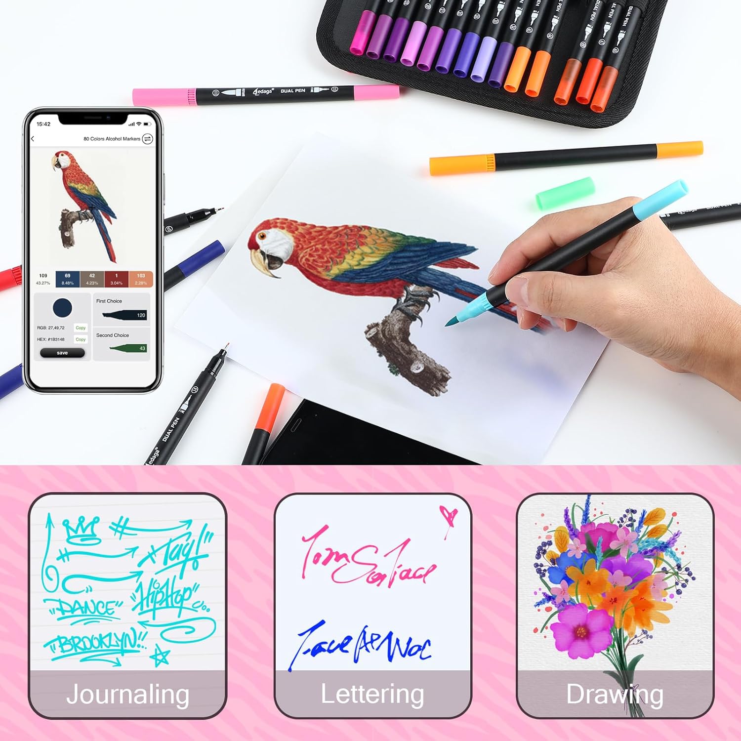 - Product Features : All dual tip brush pens have a numerical color code, and arranged neatly according to the color sequence number. We provide an APP that can recognize colors, match and recommend the color code closest to this color. By the color code on the pen body, you can quickly find the pen you need! The APP also provides functions such as graffiti coloring, color schemes, and electronic color cards, waiting for you to explore