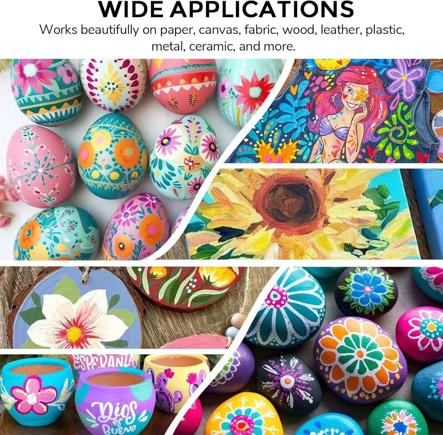 - VERSATILE USES: These acrylic paints dry quickly and adhere extremely well to surfaces. They are permanent, waterproof and will not fade and can be used indoors or outdoors, on walls, paper, glass, rocks, canvas, ceramics, fabric, plastic, metal or other materials. Suitable for everyone from beginner to intermediate or professional