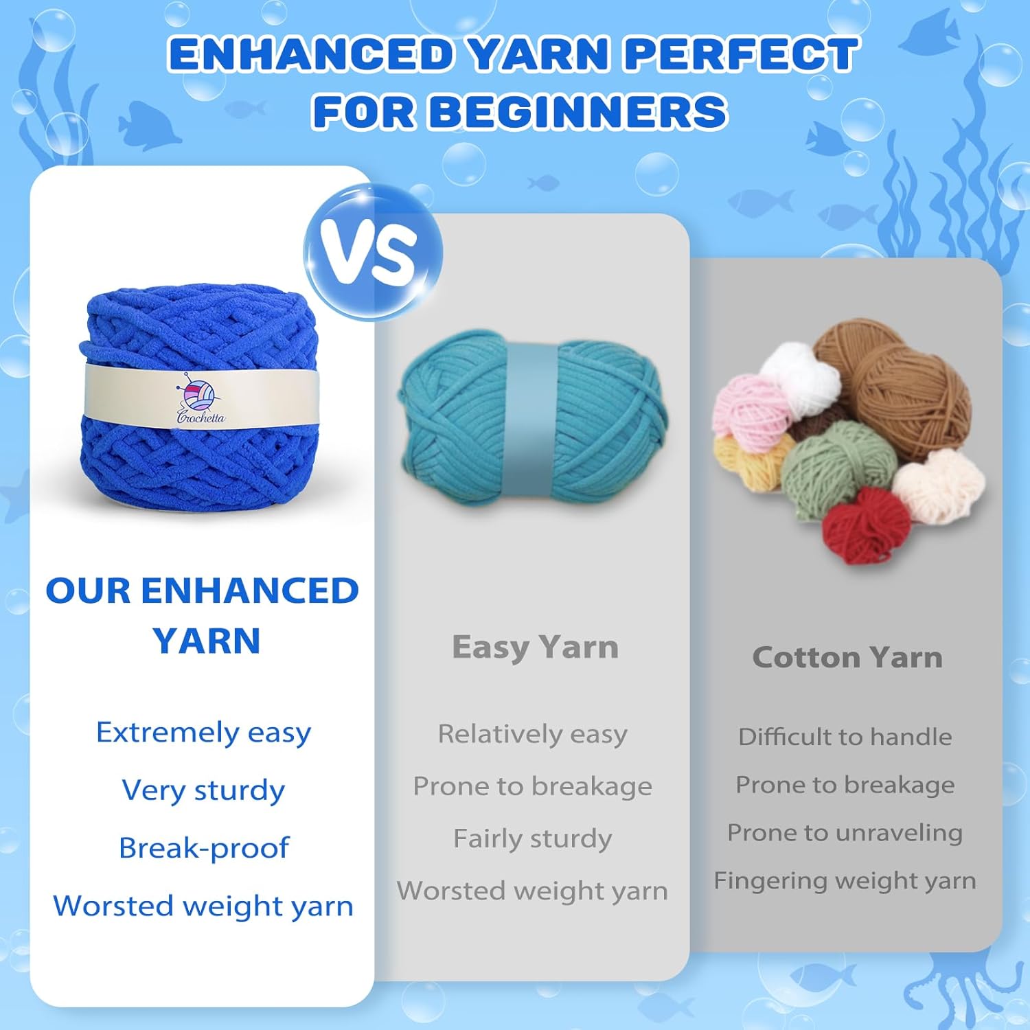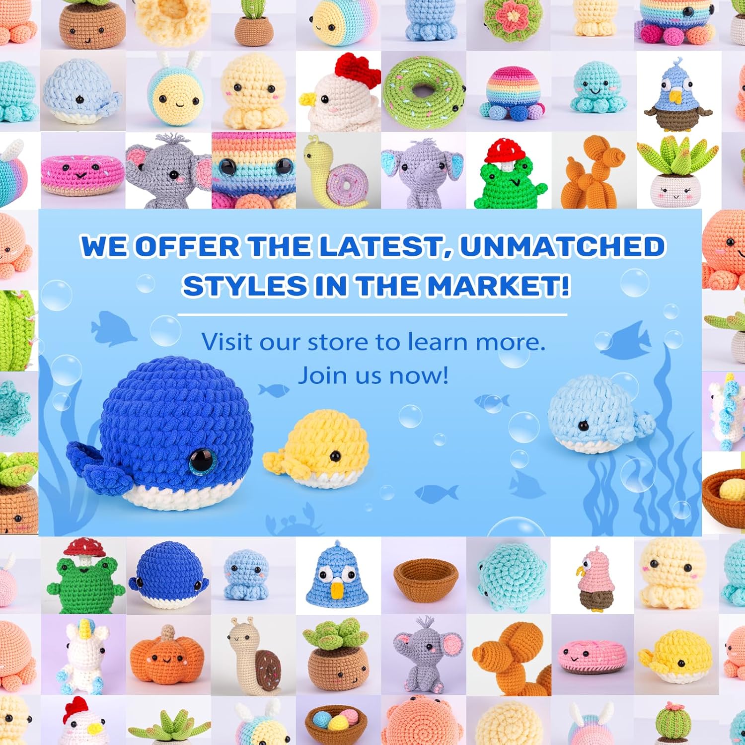 - All-In-One Crochet Kit : Our beginner crochet kit equipped with everything you need to start: 4 different colored UPGRADED BULKY YARNS (ENHANCED YARN), ample stuffing, a needle, 6 safety eyes, 5 marker buckles, 2 crochet hooks, a pair of scissors, a crochet whale pattern, and a beginner's basic crochet manual.