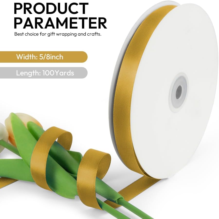 5/8 Inch 100 Yards Satin Ribbon Gold, Solid Color Fabric Ribbon for Gift Wrapping, Wedding, Polyester Gift Ribbon for Birthday Party Decoration, Craft, Hair, Floral, Sewing