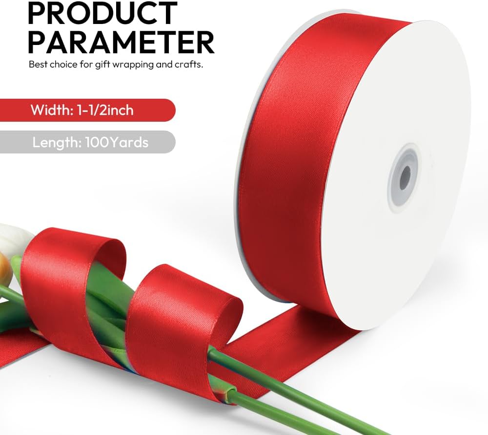 1-1/2 Inch 100 Yards Satin Ribbon Red, Solid Color Fabric Ribbon for Gift Wrapping, Wedding, Polyester Gift Ribbon for Birthday Party Decoration, Craft, Hair, Floral, Sewing