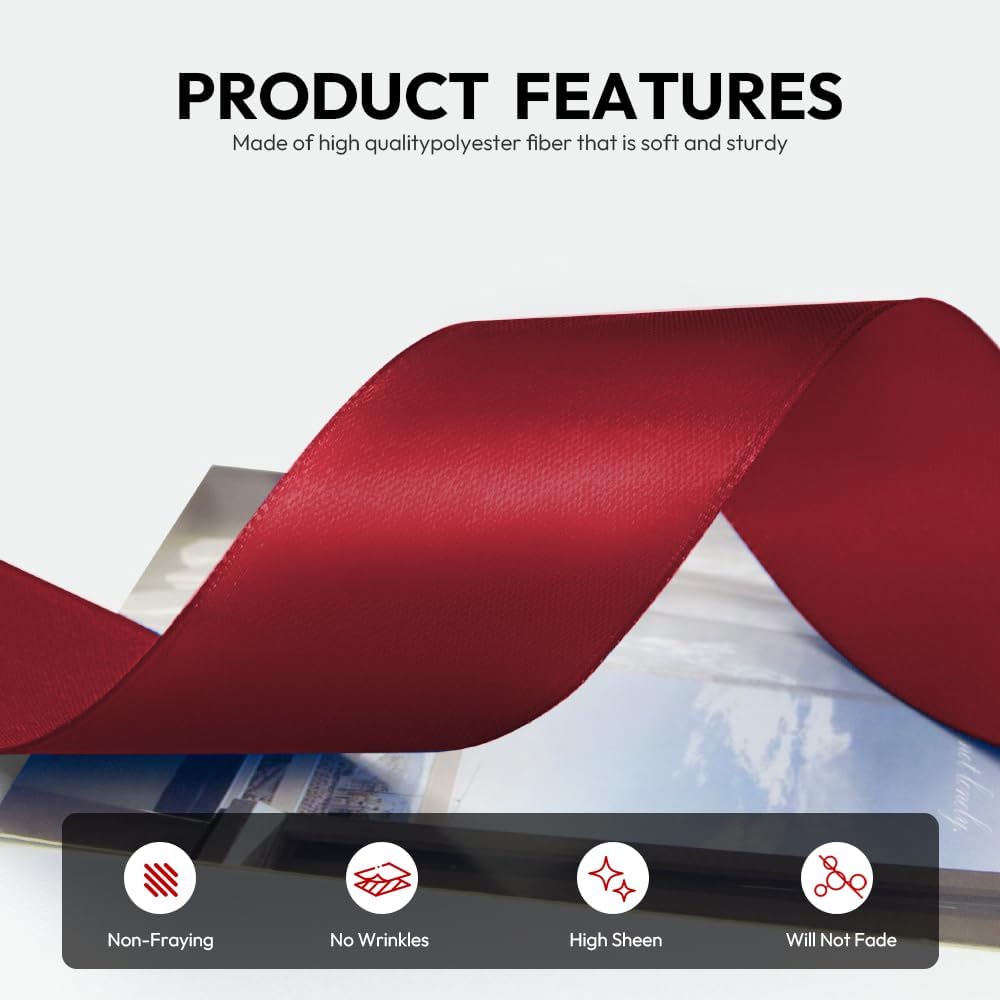 - 【High Quality】: Our fabric satin ribbon is made of 100% high-quality polyester. The single face ribbon for gift wrapping is Wine Red(Burgundy) color and has smooth texture which is easy to cut and use.