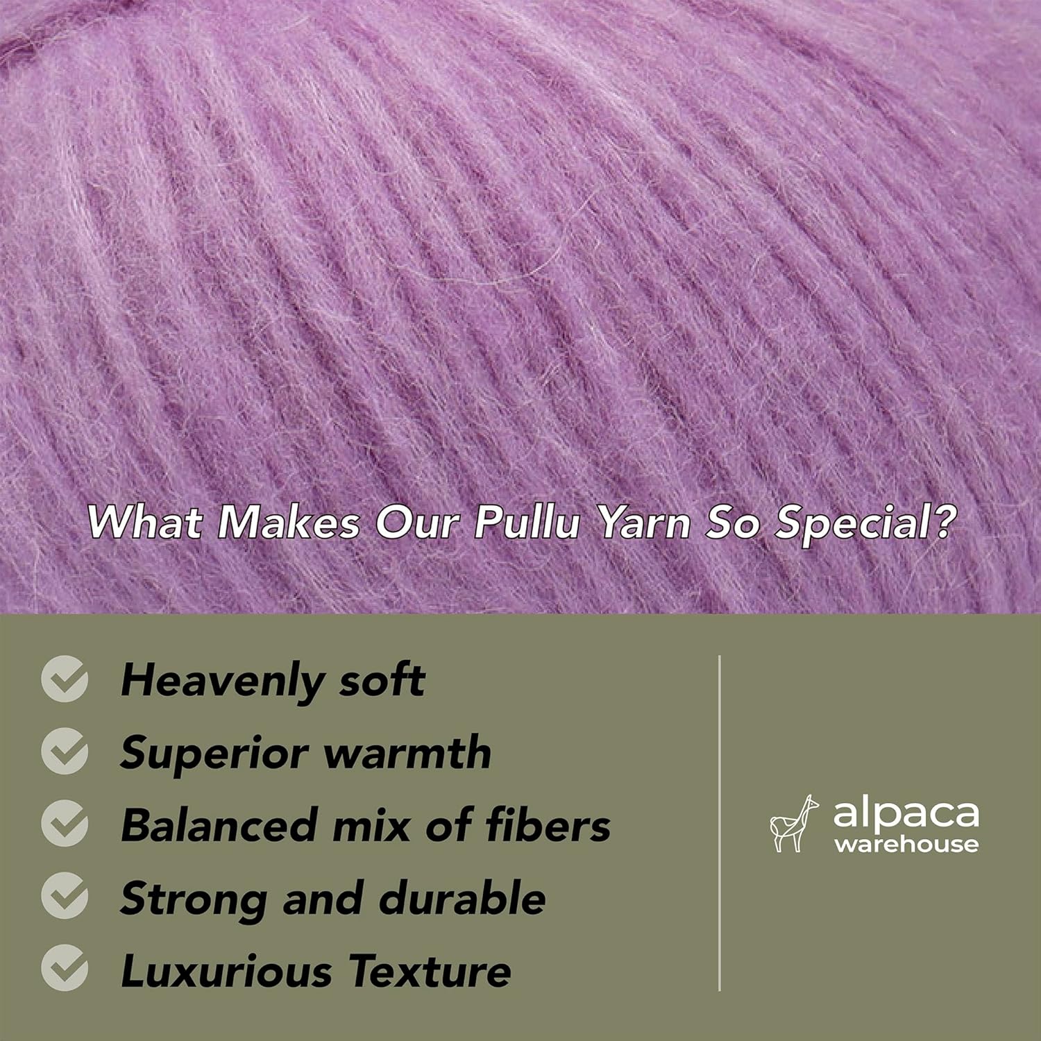 - Baby Alpaca and Merino Wool blend: Sourced directly from a manufacturer in Peru, each skein of yarn is custom-made for Alpaca Warehouse! As a result, we’re able to offer a premium wool that’s beautifully unique, surprisingly strong, and even hypoallergenic. Our yarn composition is 70% Baby Alpaca, 7% Merino Wool (21.5 mic.), 23% Polyamide.