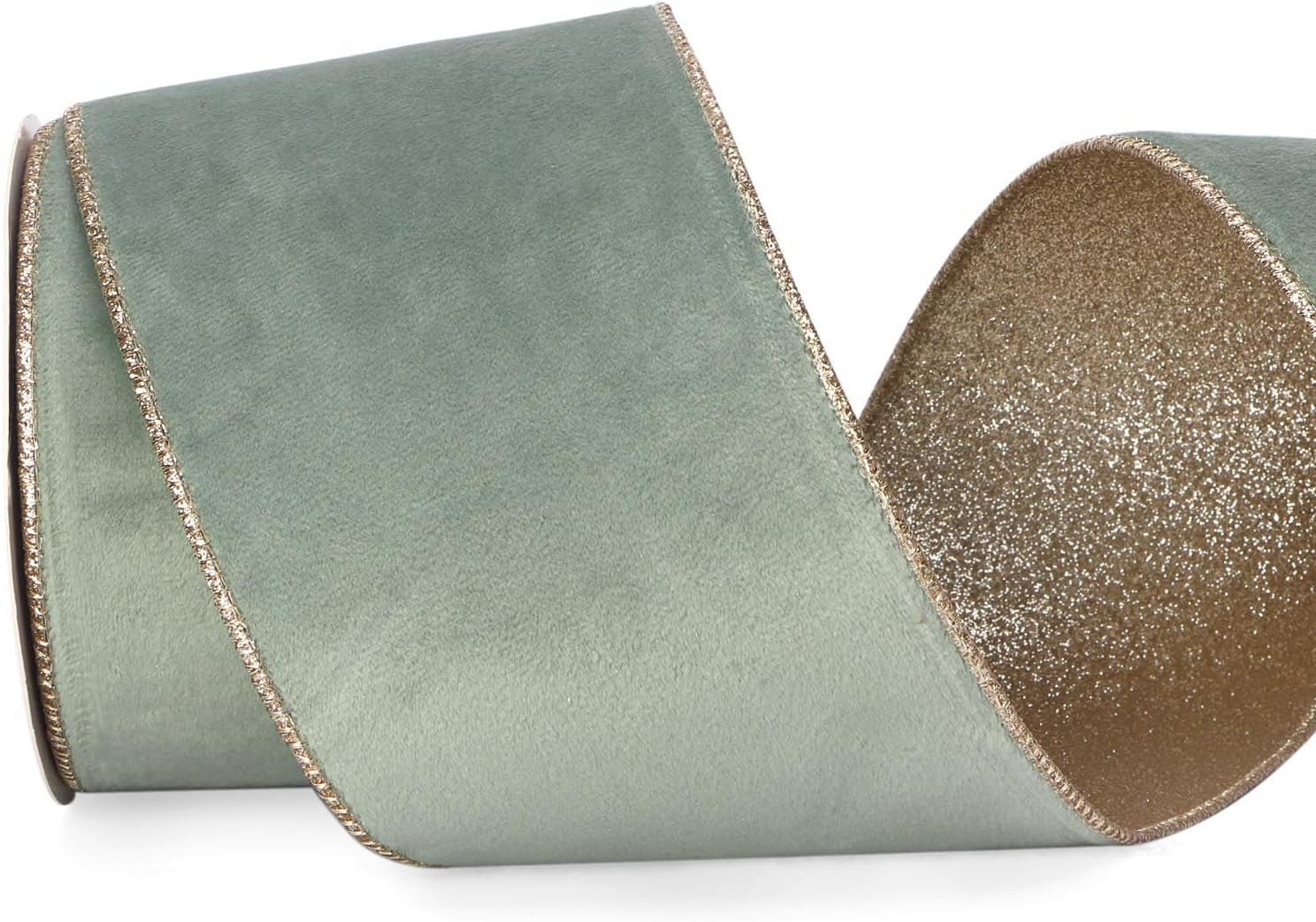 Ribbli Sage Velvet Wired Ribbon 4 Inch Sage Velvet with Champagne Glitter Christmas Ribbon for Christmas Tree Decoration Big Bow Gift Wrapping Crafts Wreaths Supplies- 10 Yards