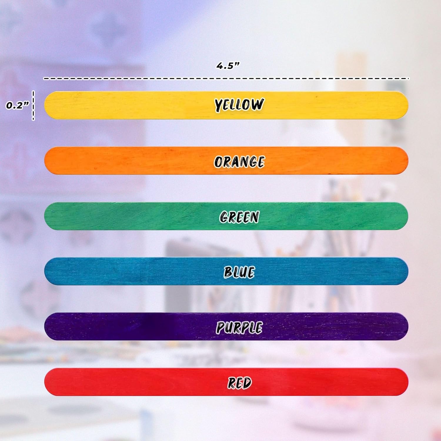 - RAINBOW STICKS: Take crafting up a notch with colored wooden sticks. Colors include Red, Orange, Yellow, Green, Blue & Purple.
