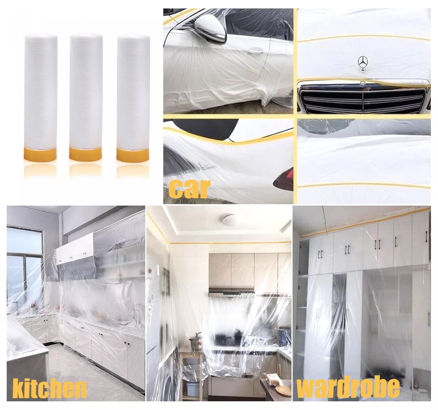 - 【Usage】Pre-taped masking film mainly use for masking and dust protection. For example: protect household appliances and furniture from dust and pigment during house decoration, car automotive painting, wall painting and so on...