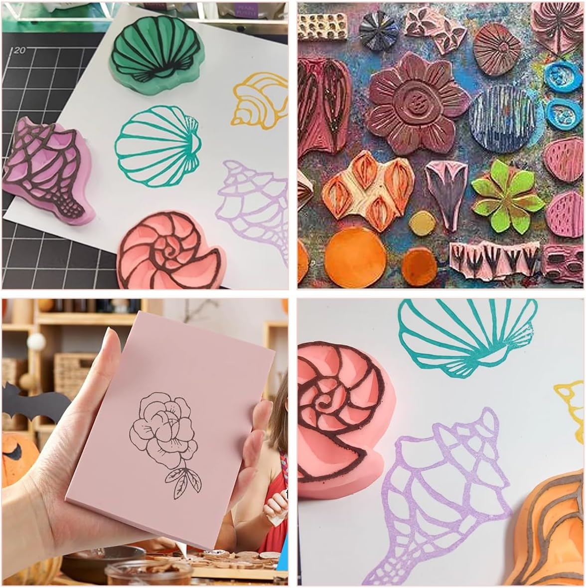 12 Pack Linoleum Blocks for Printmaking with Cutter Tools, Pink Rubber Carving Blocks Linoleum Block Stamp Making Kit for DIY Printmaking, Printing and More Crafts