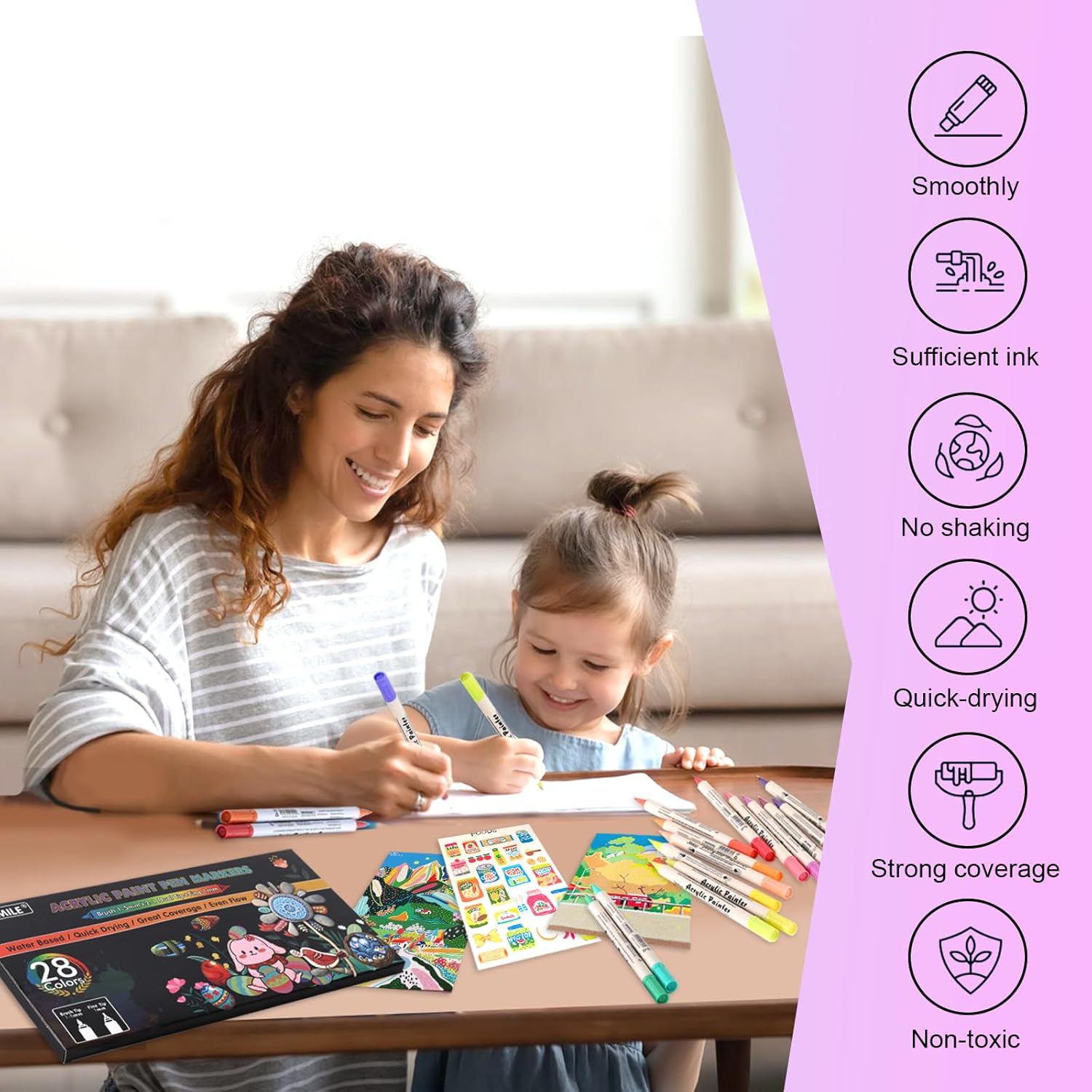 FUMILE 28 Colors Dual Tip Acrylic Paint Marker, Paint Pens paint Markers Fine Tip and Brush Tip for Rock,Wood,Plastic,Glass,Ceramic,Canvas.Acrylic Markers for Adult Coloring Book and Cards