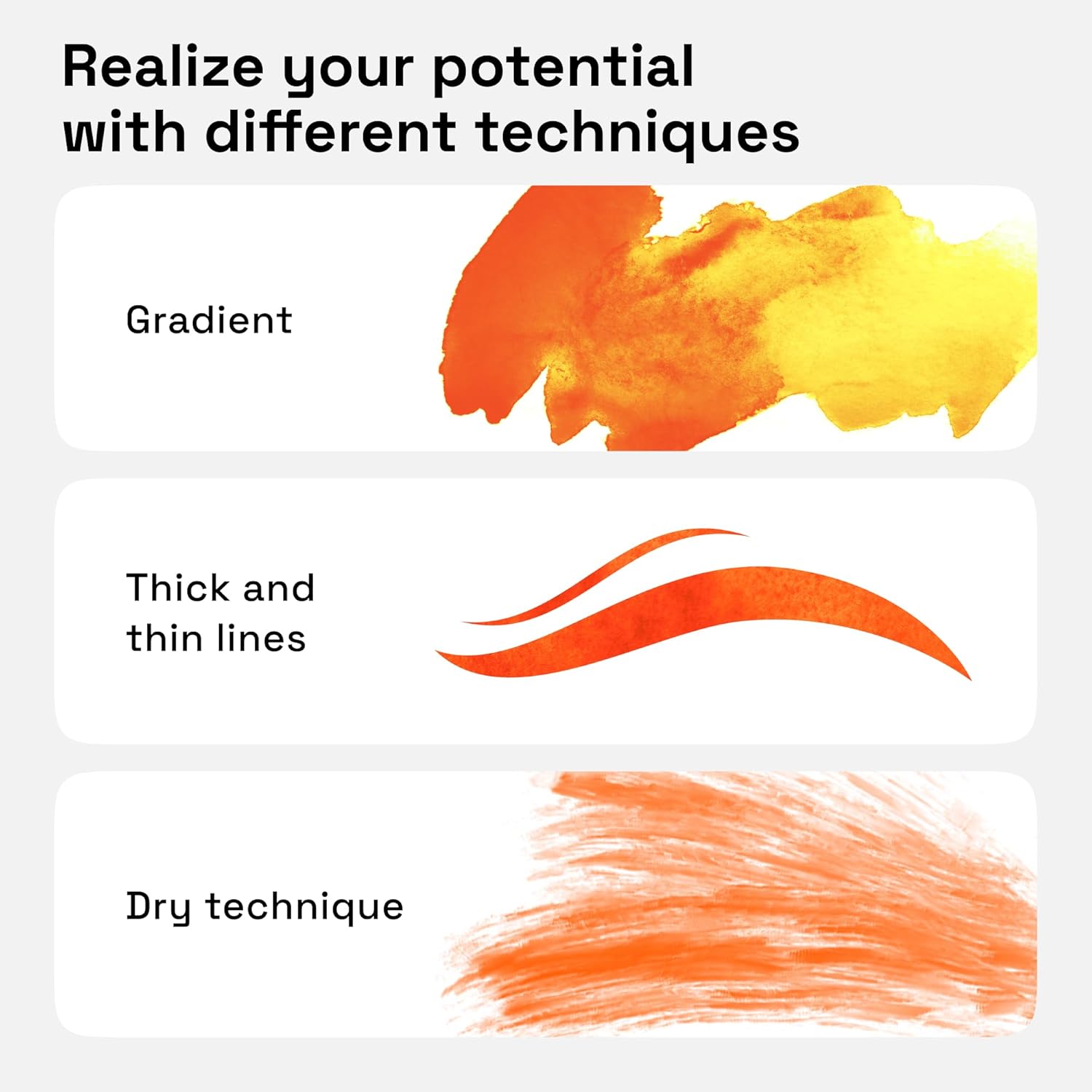 - HIGH QUALITY NYLON PAINTBRUSHES: The nylon brushes on these watercolor brush pens have 0.05-5 mm tips that are self-moistening, self-cleaning, and won't fracture. No need to wet the brushes, just paint and go!