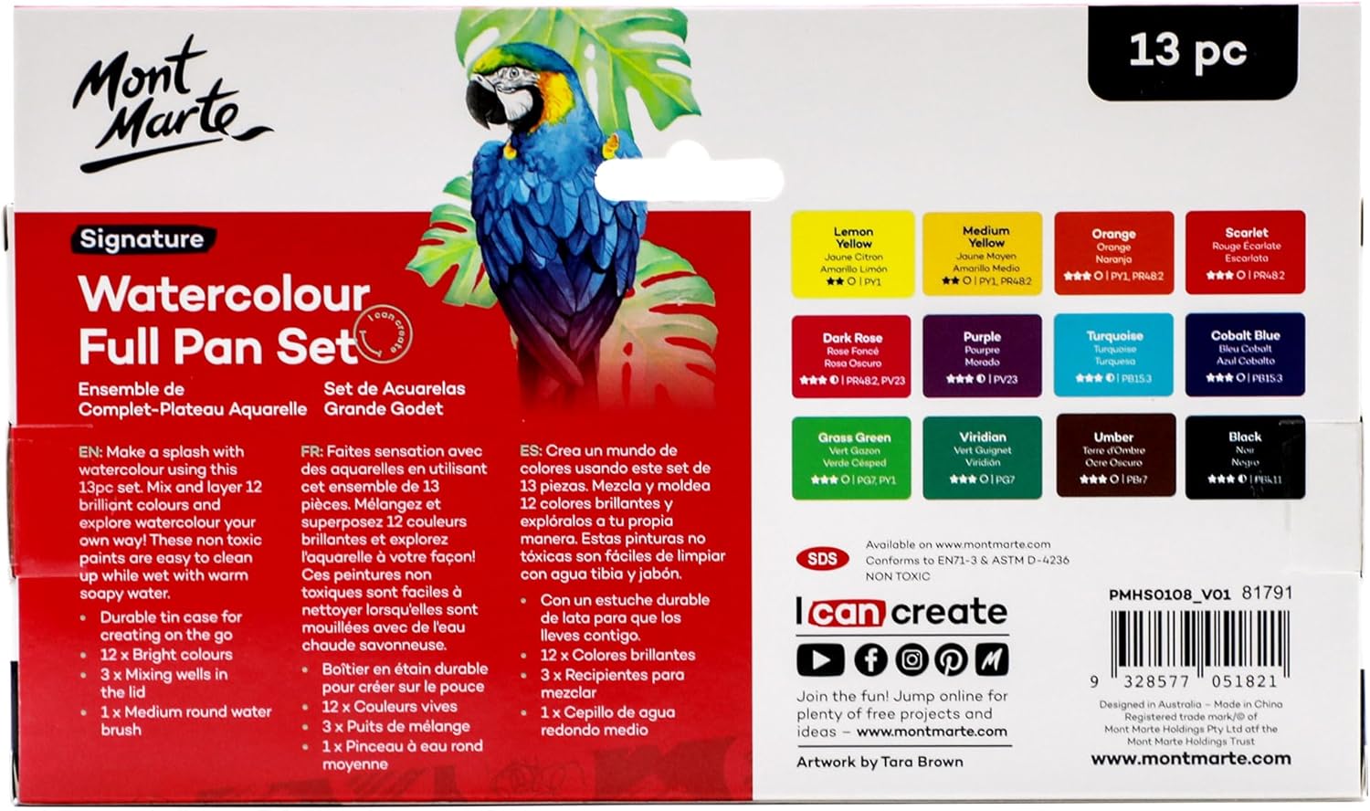 Mont Marte Watercolor Set Full Pan Signature 13pc in Tin, Vibrant, Multi-Color with Translucent Finish, Portable Watercolor Set