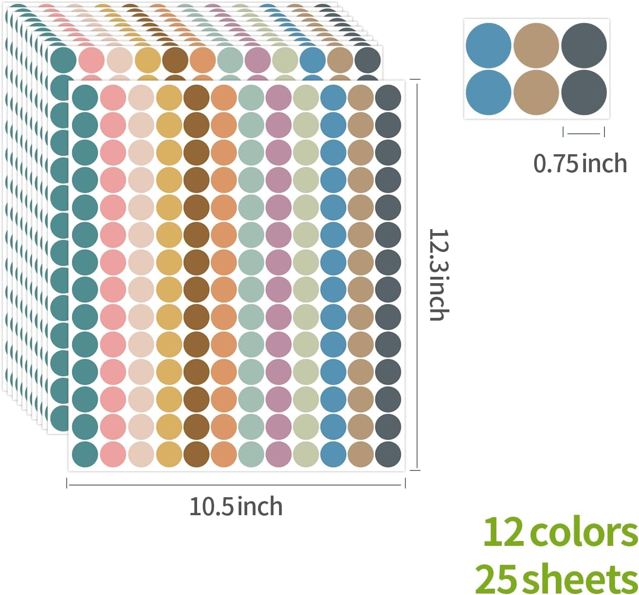 - ※【4200 PCS Boho Round Stickers】4200 PCS 0.75 inch diameter boho style color coding dots round stickers,each sheet of 3/4 inch colored dot stickers have 12 different colors,168 pieces for each sheet, 25 sheets in total, sheet size: 12.3" L x 10.5" H.