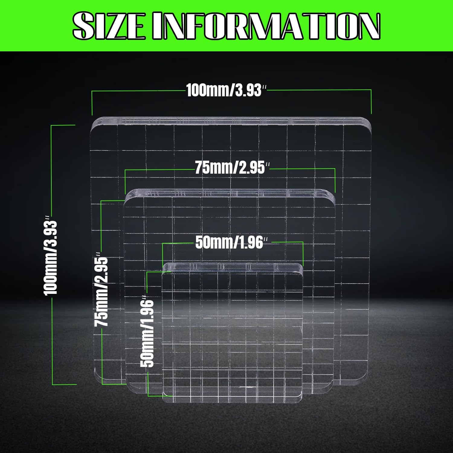 - Package Contents: 3 acrylic stamp blocks in 3 different sizes including 2 x 2 inches, 3 x 3 inches, 4 x 4 inches. Each is 0.31 inches thick. NOTE: This is a protective cover to protect the stamp block from scratches, please peel off the cover before use.