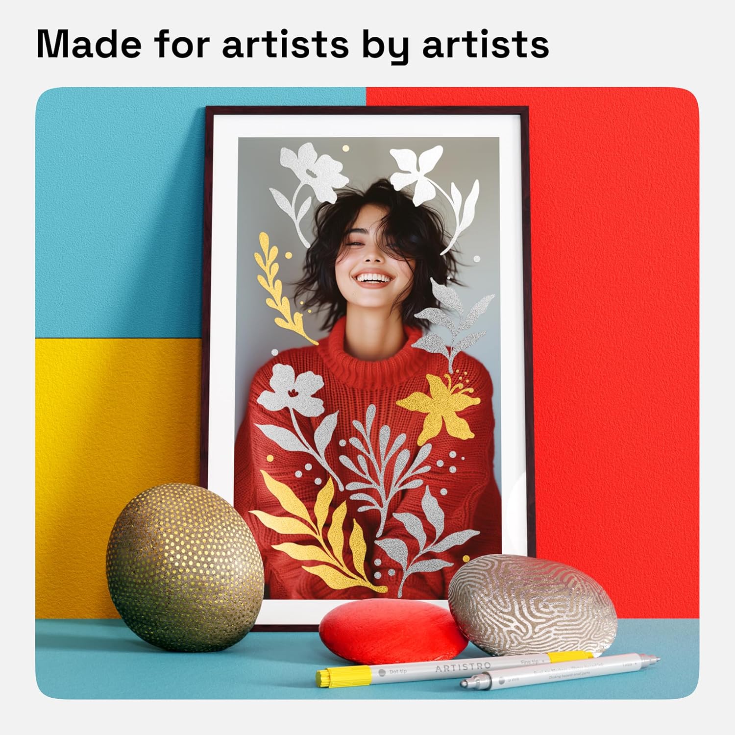 ARTISTRO 2 Gold&Silver Dual-Tip Acrylic Paint Pens - Multisurface Markers for Glass, Rock, Fabric, Wood, Plastic & More - 5mm Dot + 1mm Fine Tips