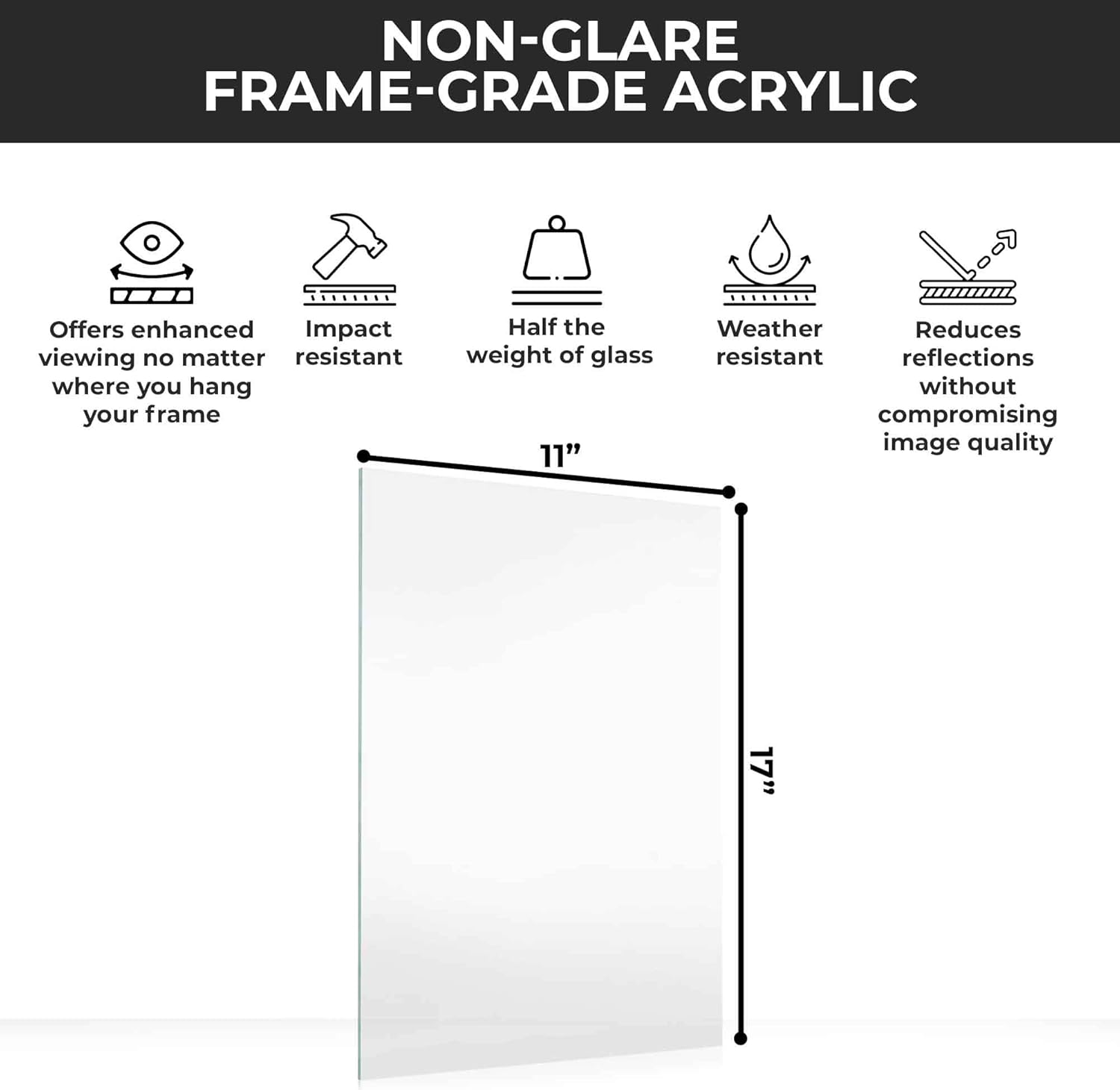 - INCLUDES: 11x17 Non-Glare Frame-Grade Acrylic glass replacement. Additional sizes available to fit your standard and non-standard picture frames.