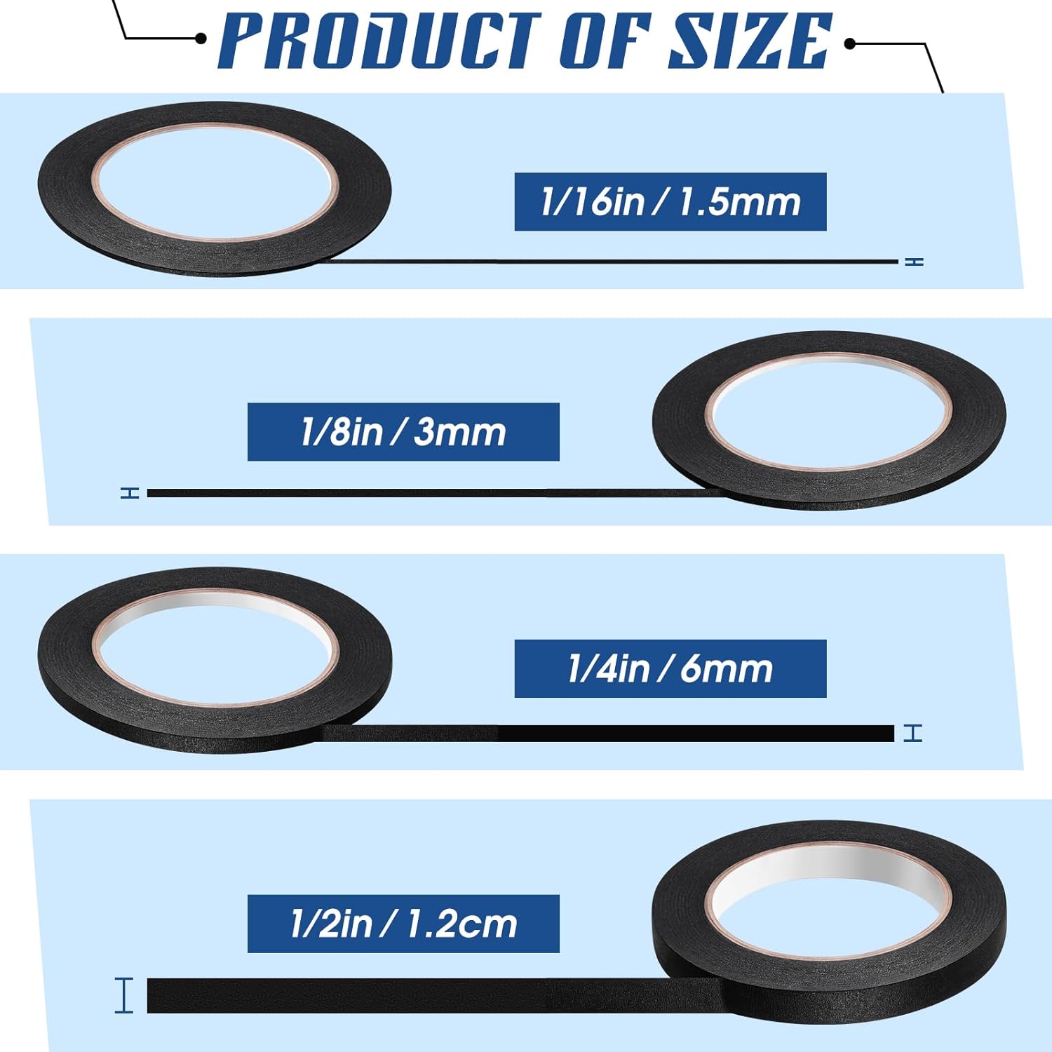 - You Will Get: there are 4 rolls of masking tapes with different widths, which are about 1/16 inch/ 1.5 mm, 1/8 inch/ 3 mm, 1/4 in/ 6 mm and 1/2 inch/1.26 cm; Each masking tape length is about 55 yd/ 50 m; Different widths can meet your various needs, and adequate length gives you a longer time service; These masking tapes will let you post the shape, length and width you want at will