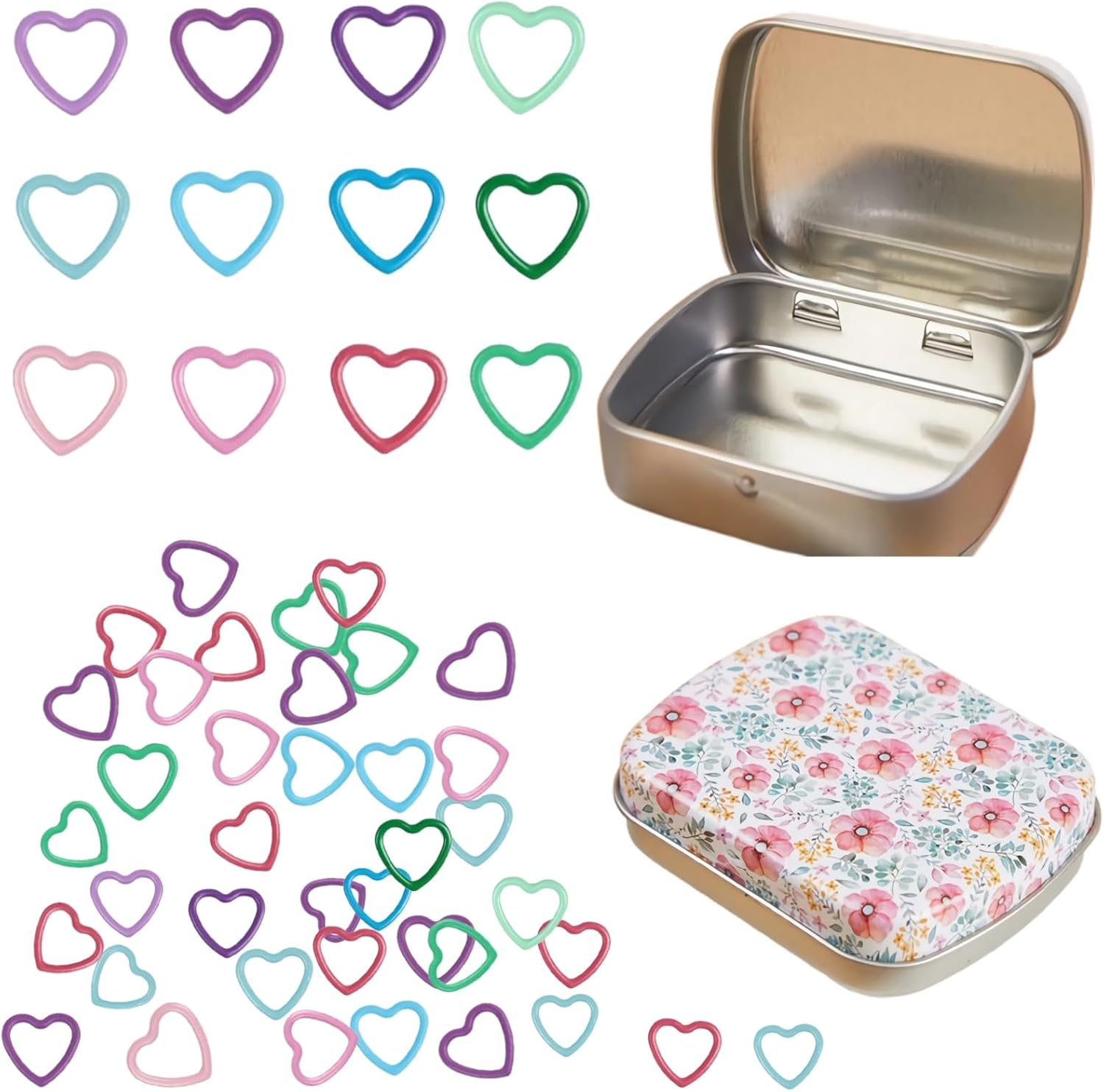 Hilsayum 50Pcs Heart Shape Stitch Markers for Crocheting,Crochet Stitch Markers with Floral Design Small Tin Box