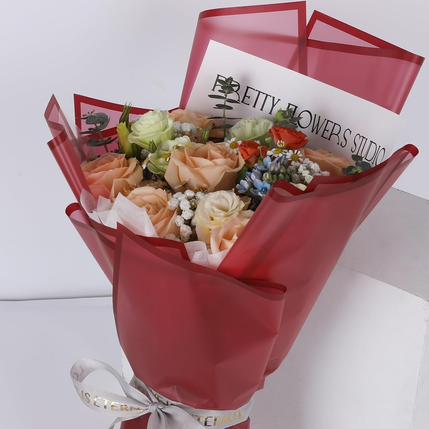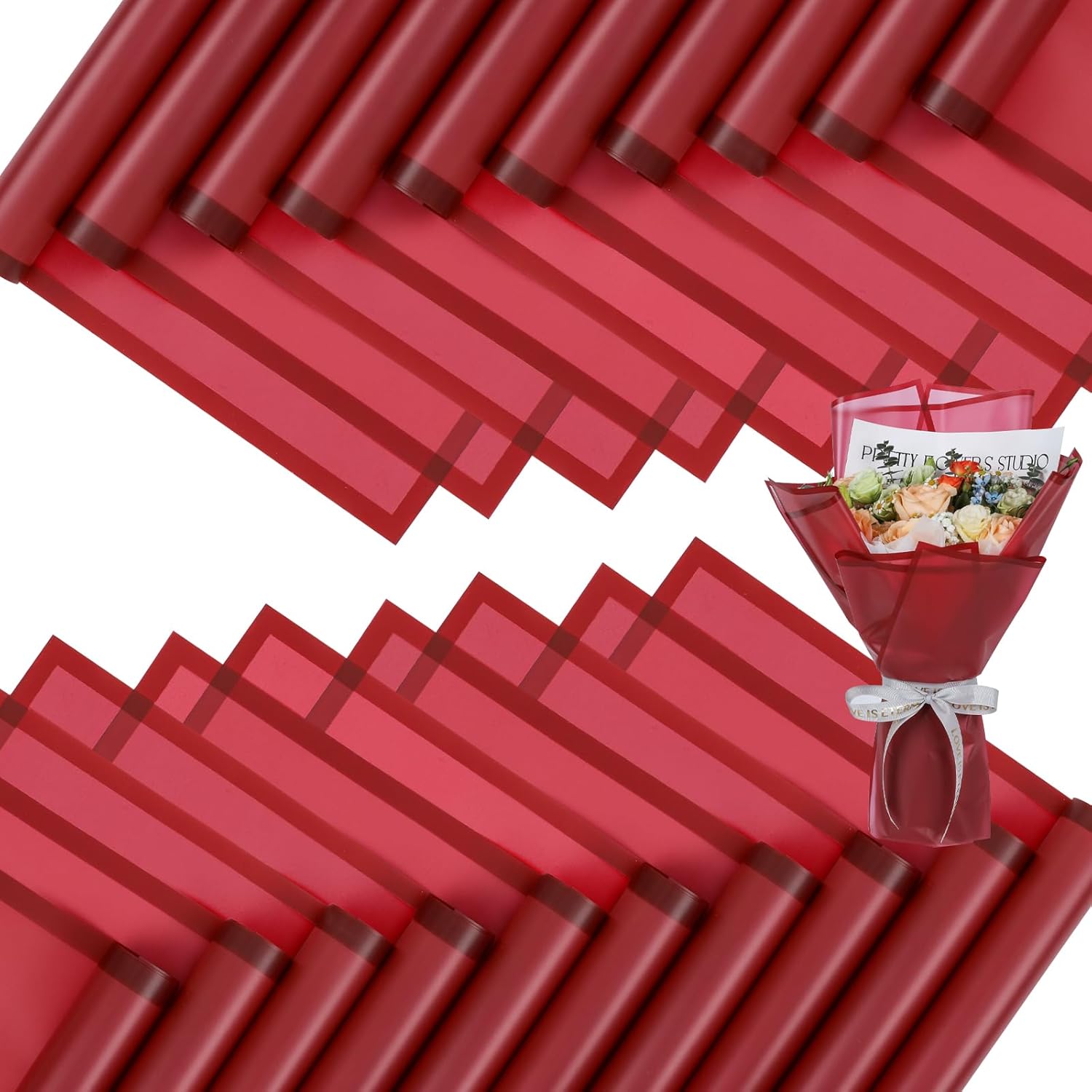 - 【Elegant Design】Florist paper is designed with using classic semi transparent material, the edges are designed in wine red color with a frosting, features glossy and vibrant colors, smooth and comfortable to touch. Is the perfect choice for bouquet packaging and gift box packaging.